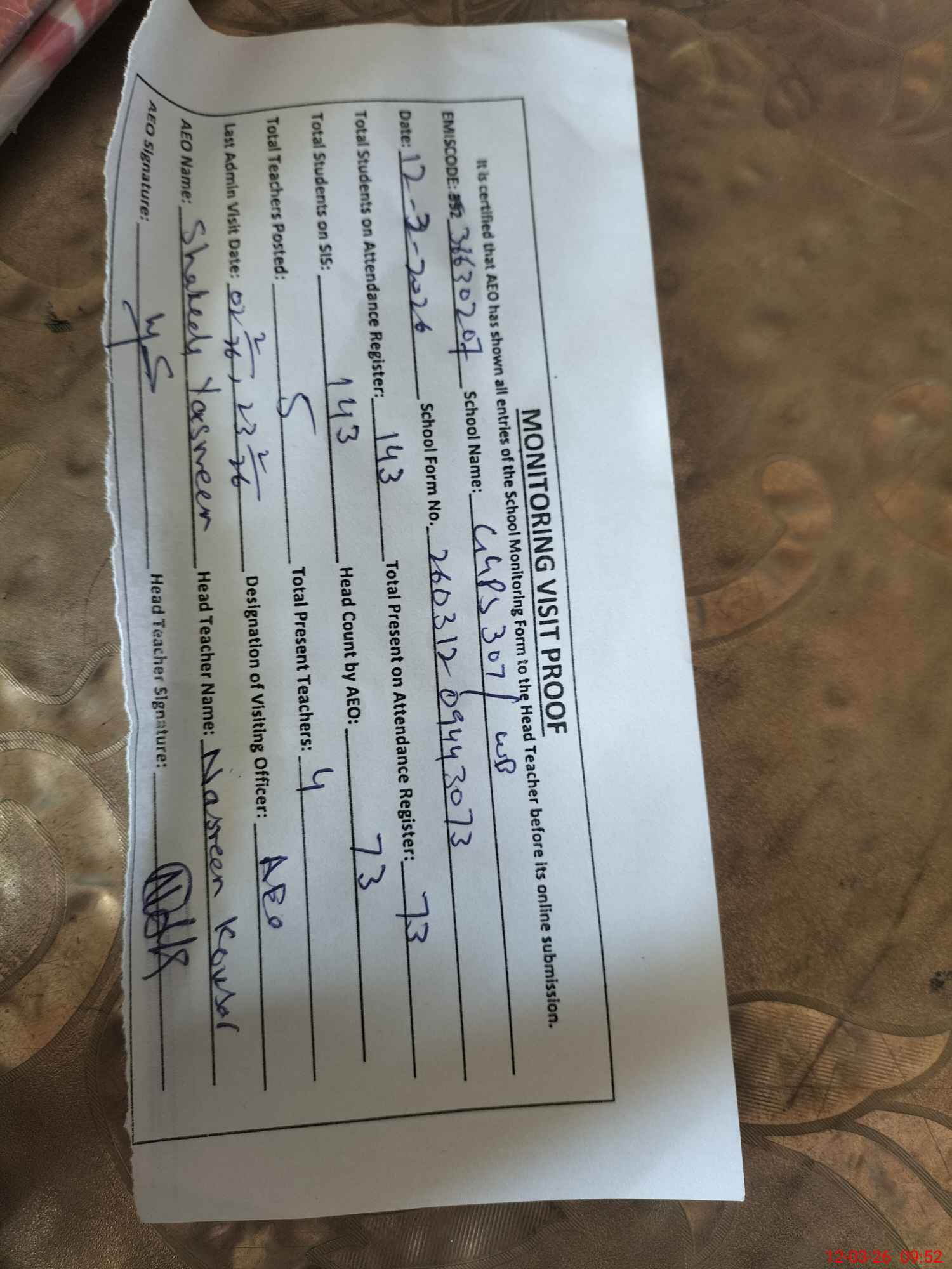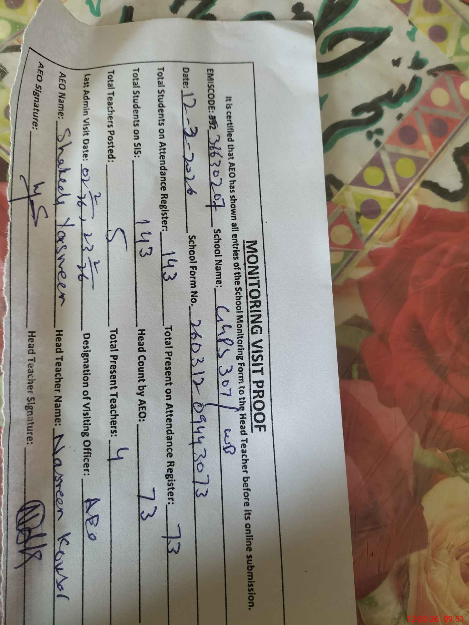 | Attendance Register | Head Teacher | MEA with School | Visit Proof |
