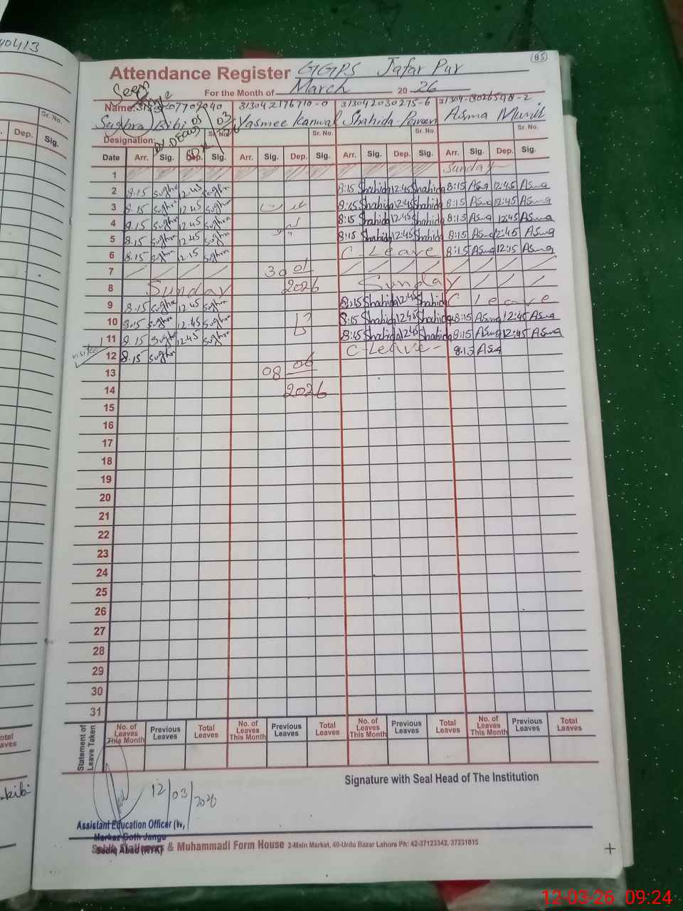 | CNIC | Full Name | Designation | R/C | Absence During Last Calender Month |