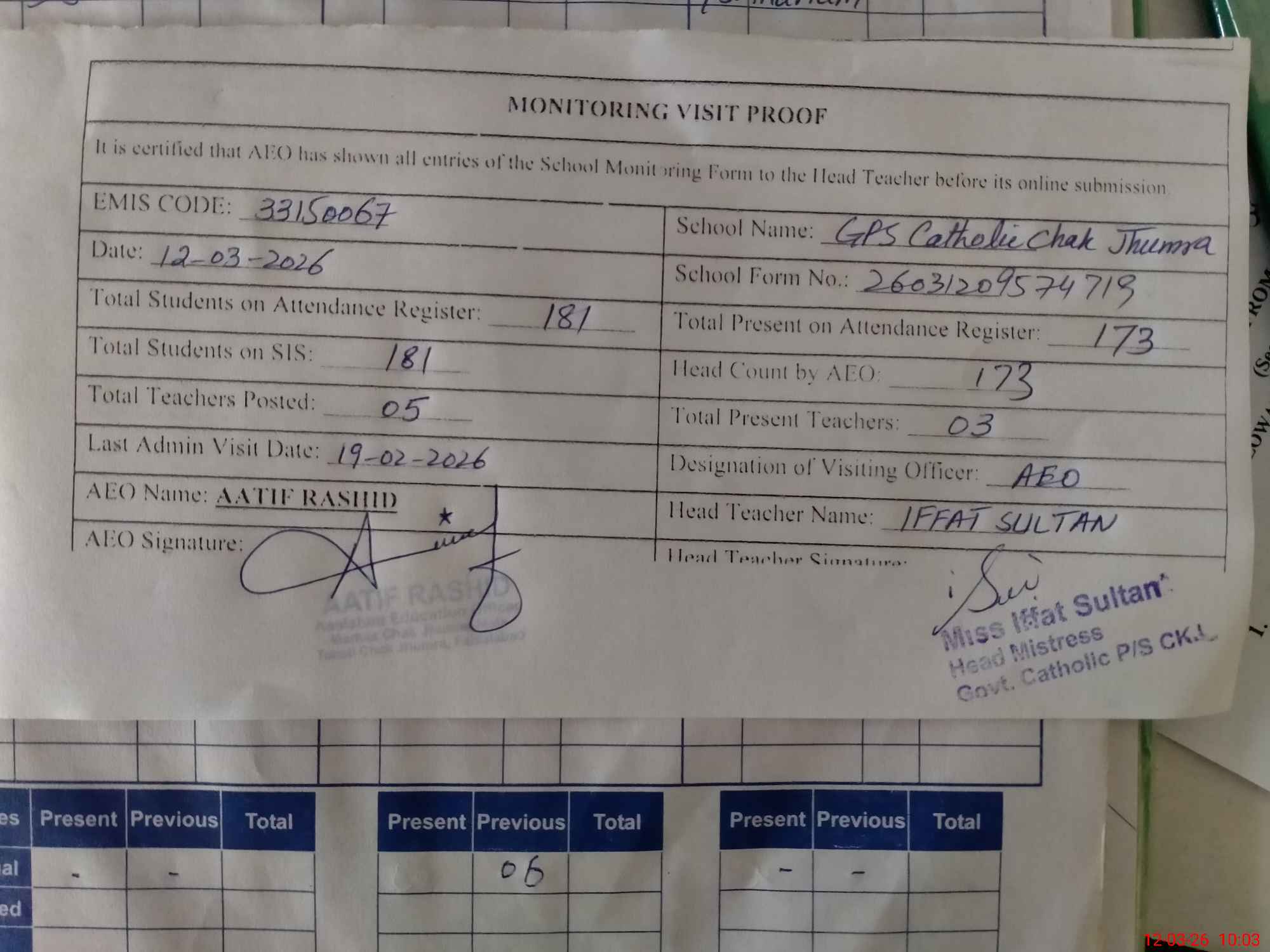 | EMIS Code: 33150067 | Name of School: GPS CATHOLIC CHAK JHUMRA | |||