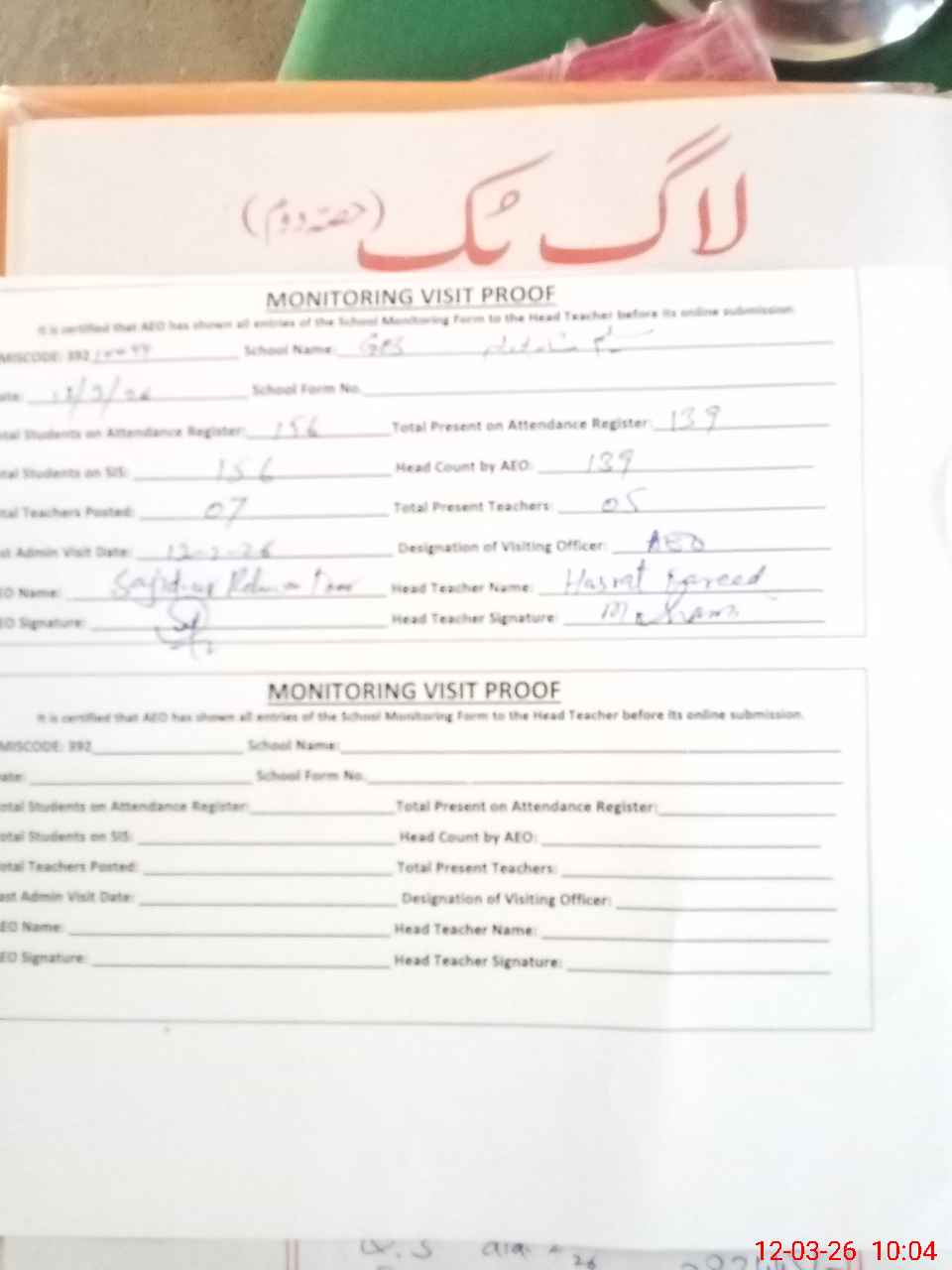 | Attendance Register | Head Teacher | MEA with School | Visit Proof |
