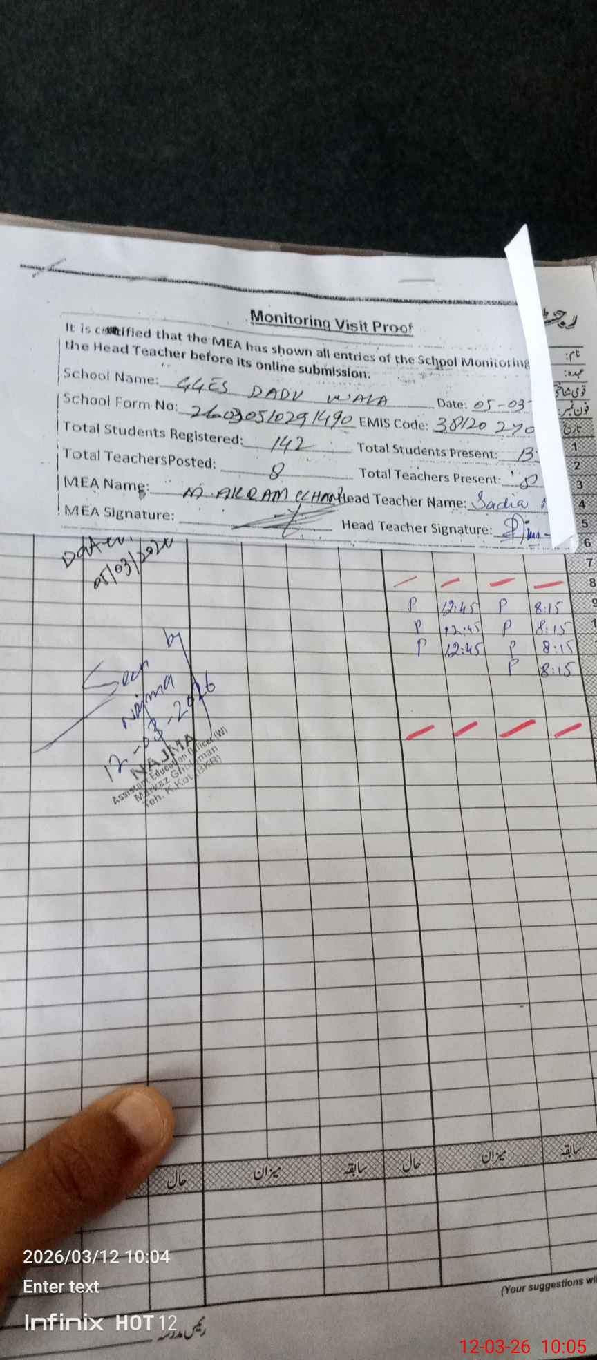 | Attendance Register | Head Teacher | MEA with School | Visit Proof |