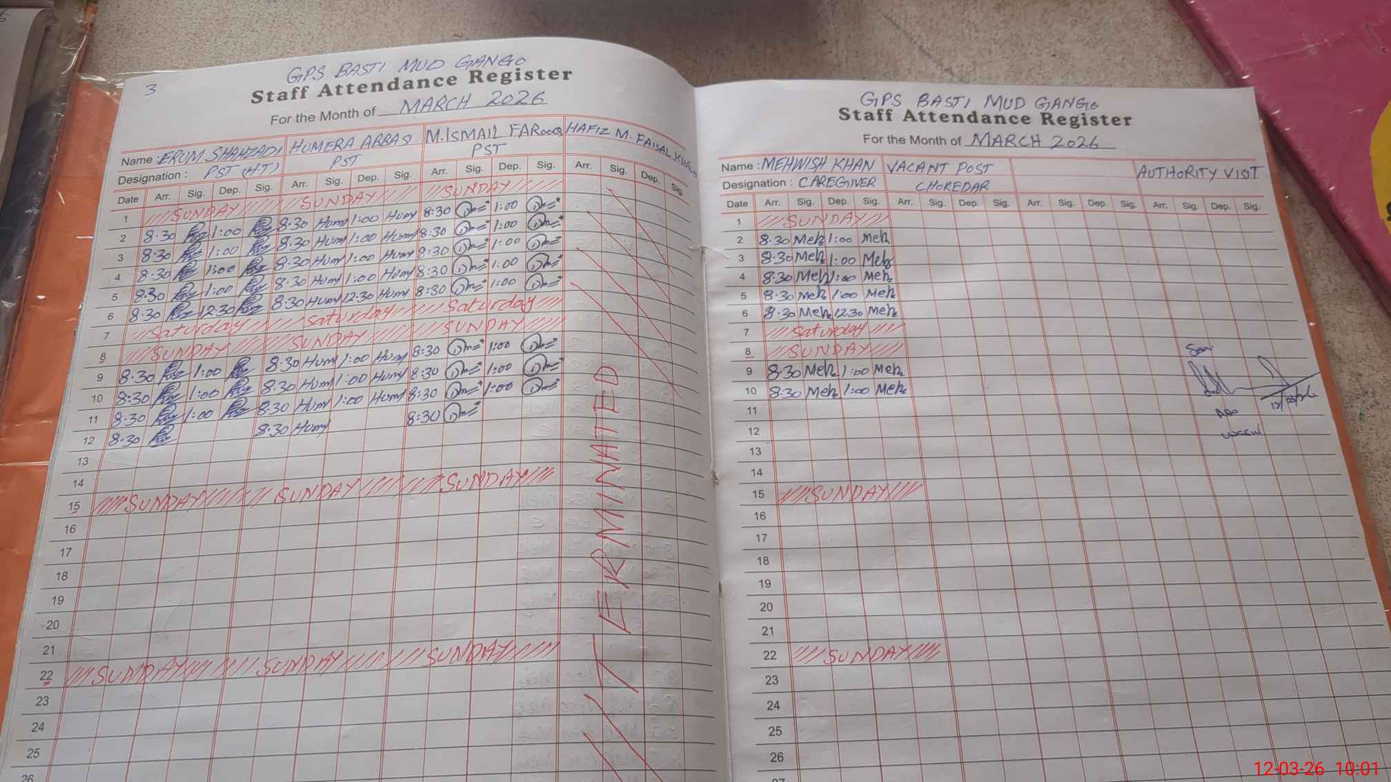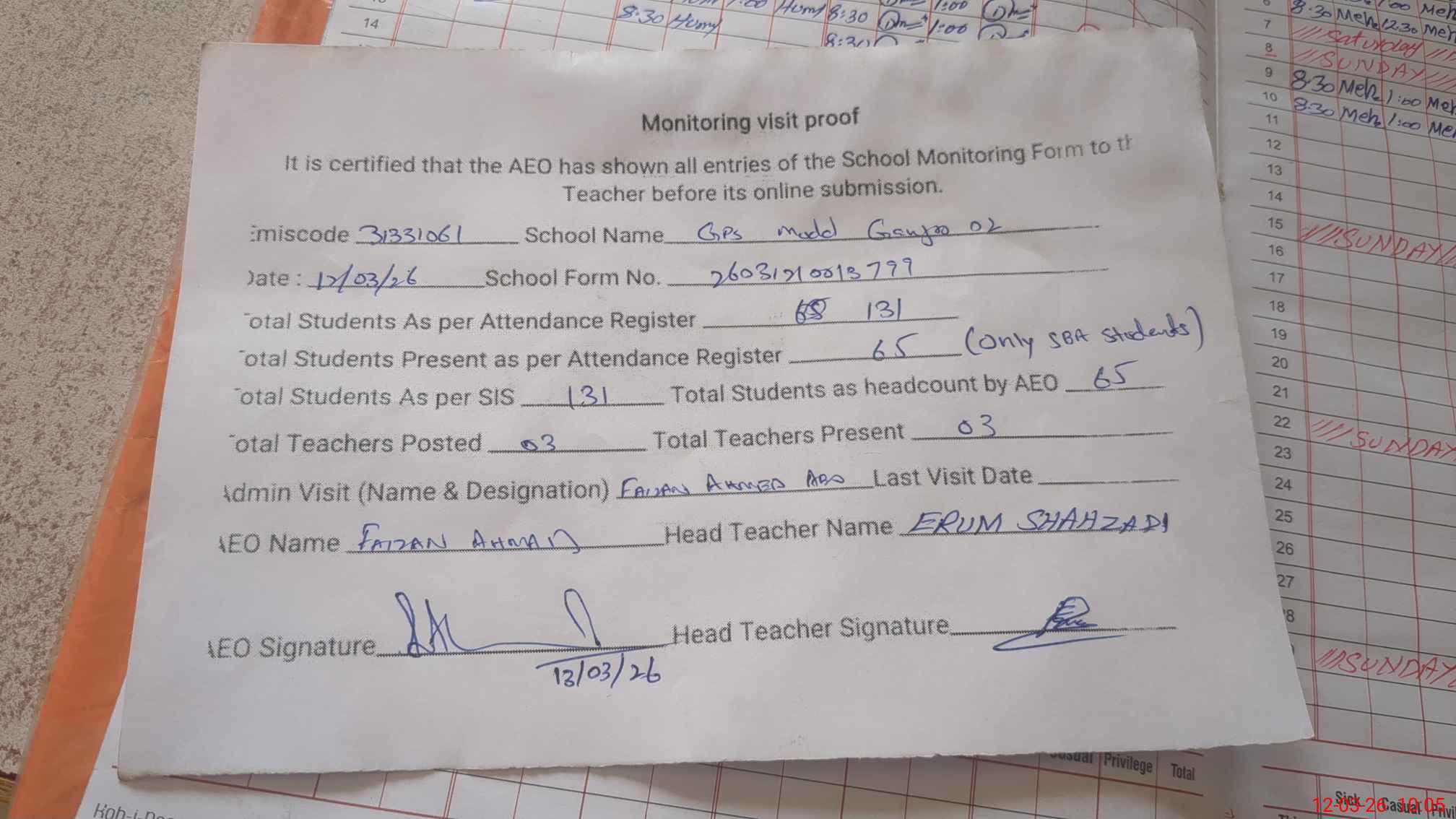 | Attendance Register | Head Teacher | MEA with School | Visit Proof |