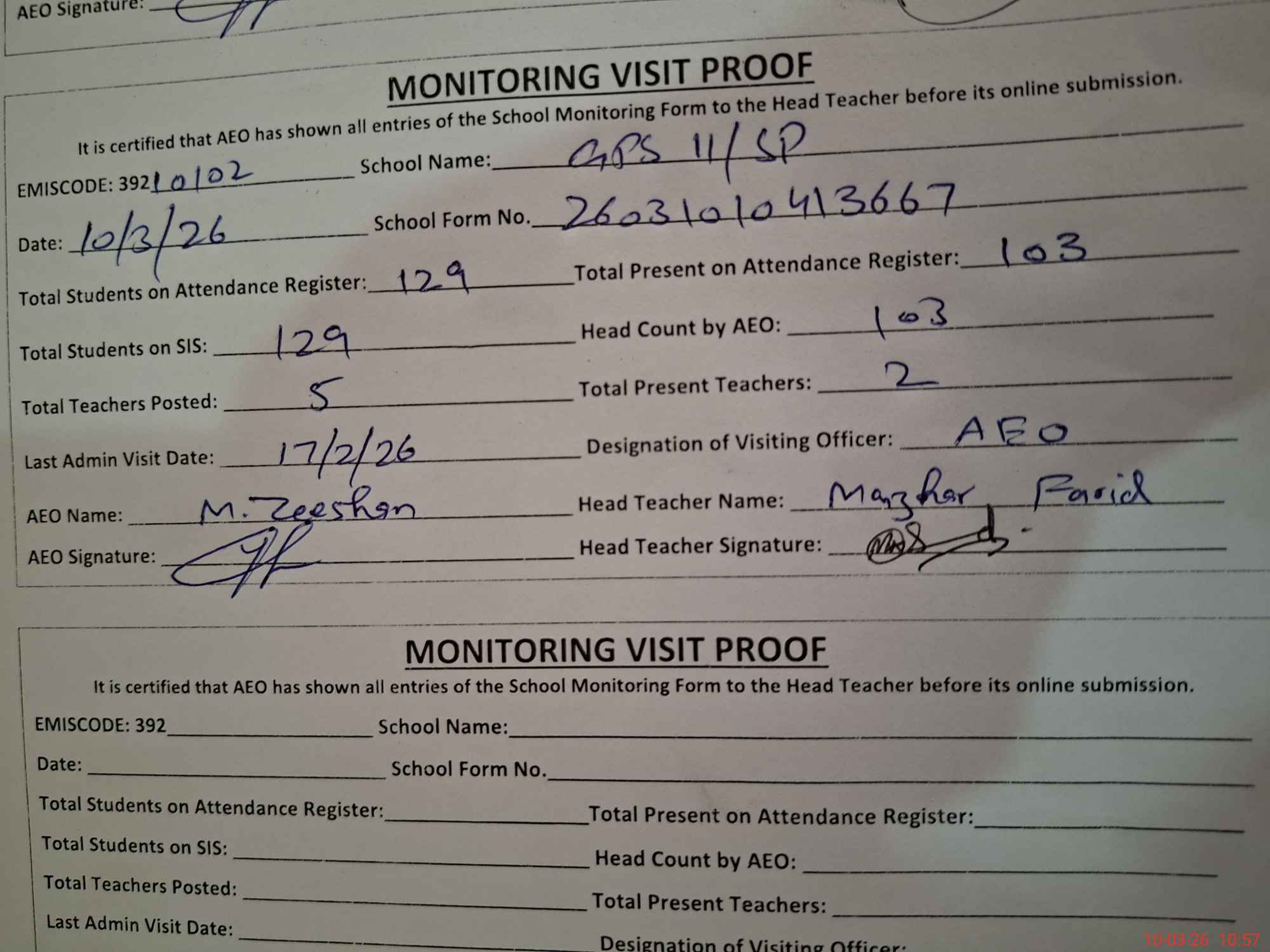 | Monitoring Date: 10-03-2026 | Start Time: 10-03-2026 10:41 AM | End Time: 10-03-2026 10:57 AM | Name of MEA: Mu**** Ze**** | |