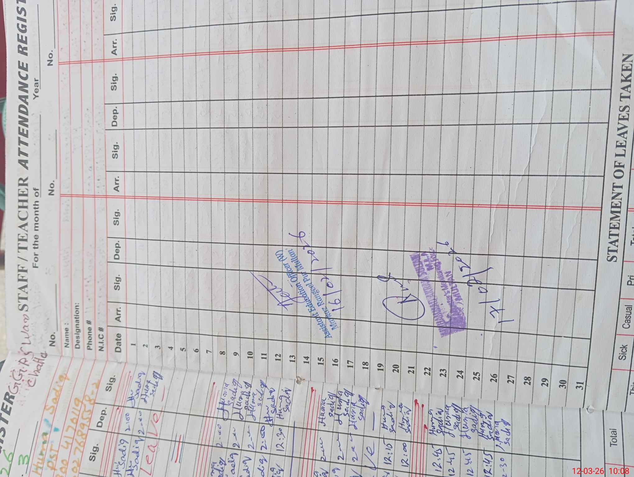 | 36**** | Hu**** Sa**** | PST Arts | Regular | 0 | 0 | 0 | 0 | 0 | 0 | 0 | 0 | 0 | Exam Duty |
