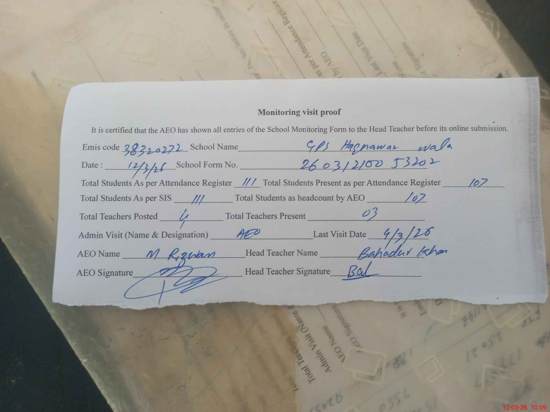 | Attendance Register | Head Teacher | MEA with School | Visit Proof |