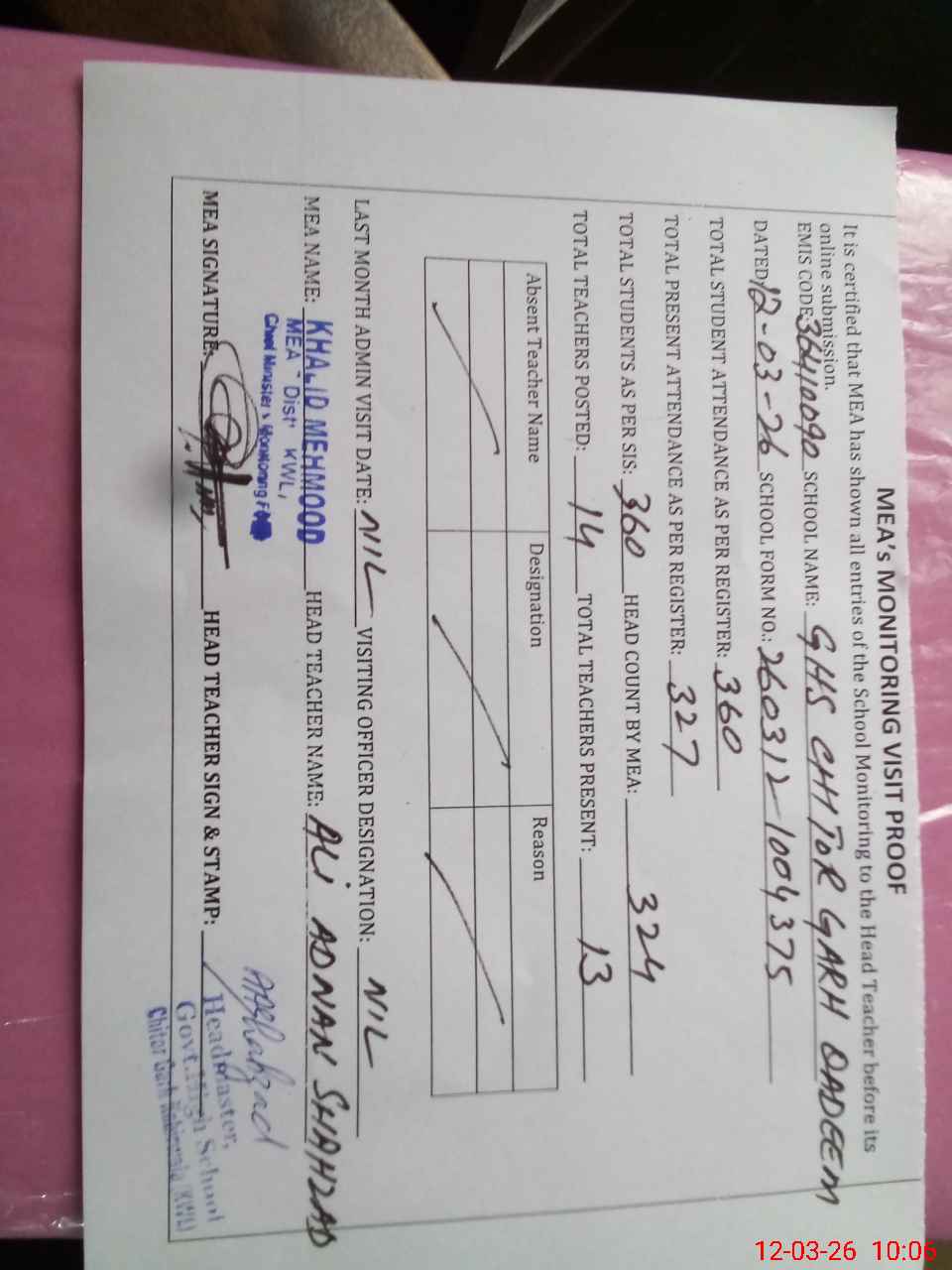 | EMIS Code: 36410090 | Name of School: GHS CHITOR GARH QADEEM, P/O CHAK HAIDER ABAD, NAWAN SHEHR | |||