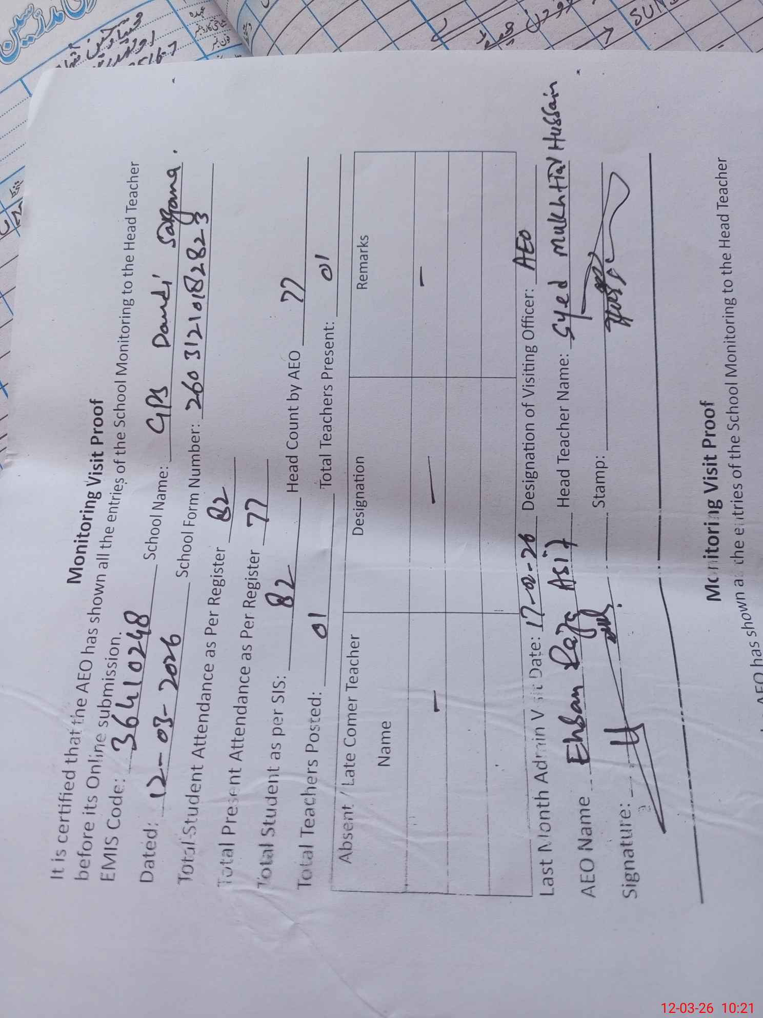 | Attendance Register | Head Teacher | MEA with School | Visit Proof |