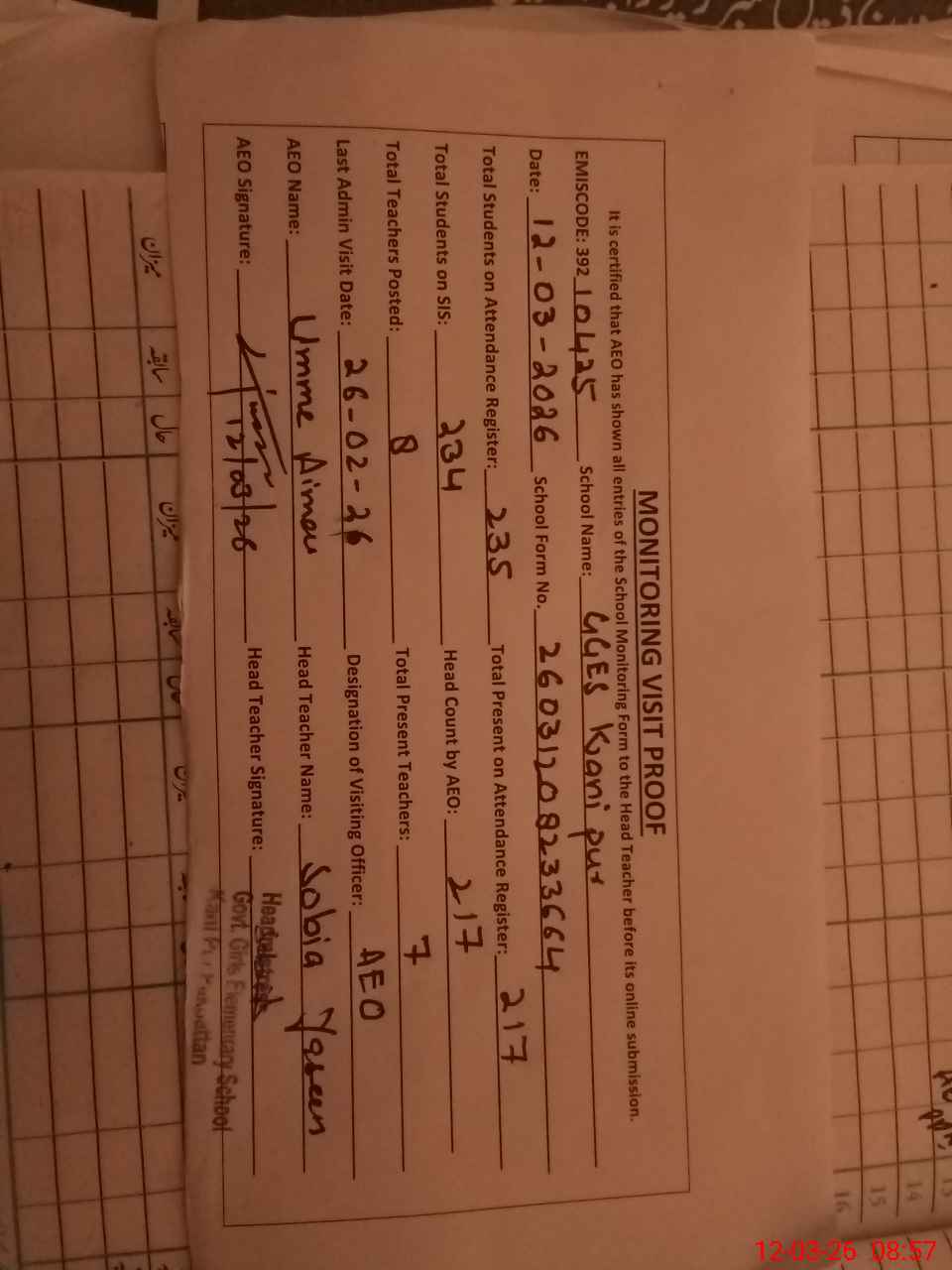 | Certified that this School was Inspected by the Undersigned MEA/DMO Today and the Information Stated Above is as Per Record. | |||||