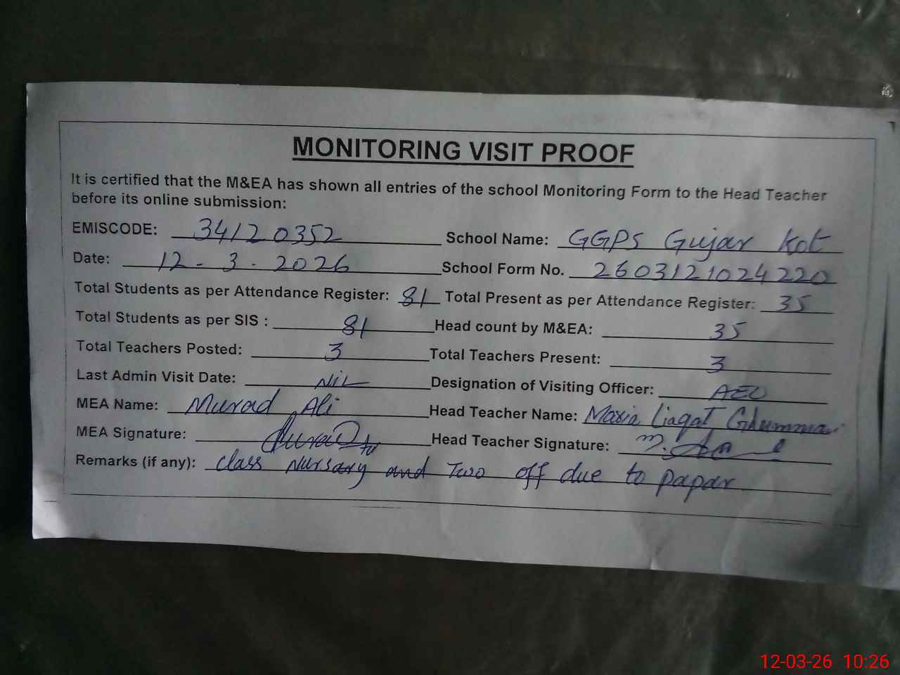 | Attendance Register | Head Teacher | MEA with School | Visit Proof |