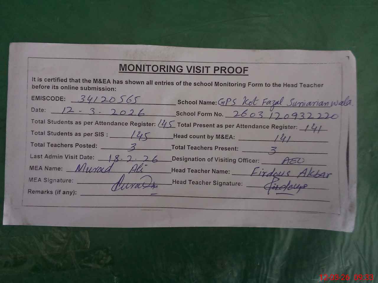 | Attendance Register | Head Teacher | MEA with School | Visit Proof |