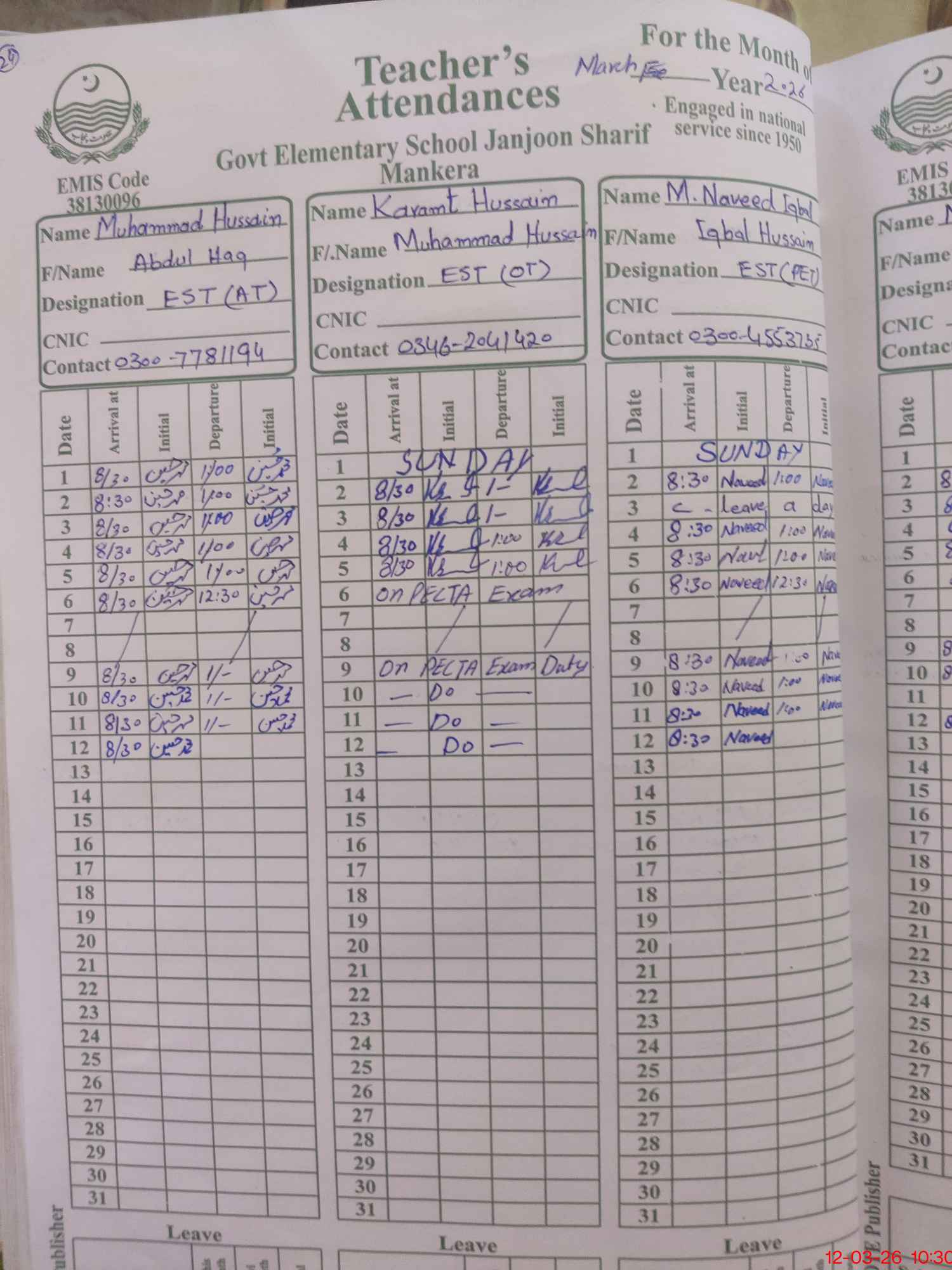 | 38**** | Ka**** Hu**** | EST Oriental | Regular | 0 | 0 | 0 | 0 | 0 | 0 | 0 | 0 | 0 | Exam Duty |