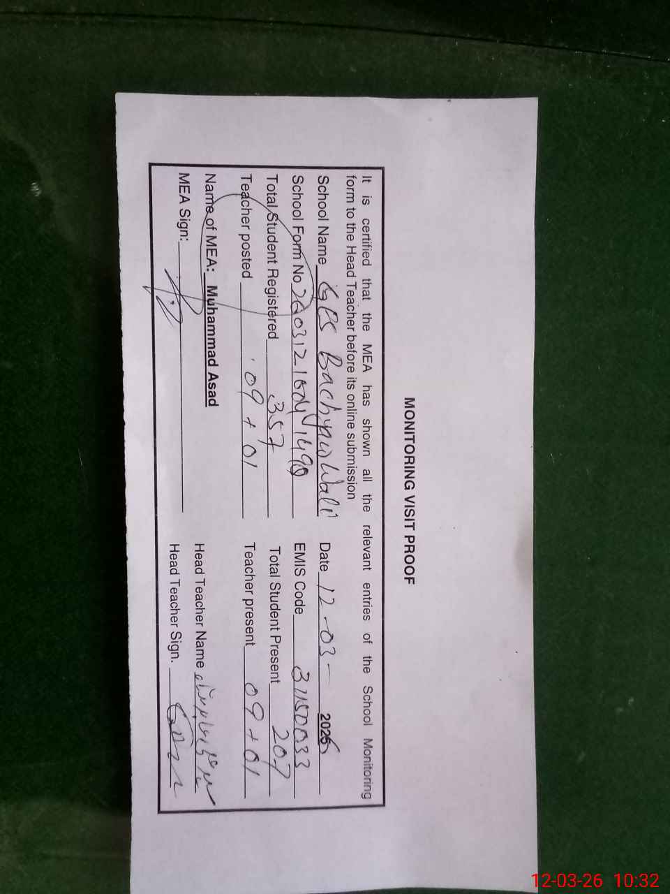 | Attendance Register | Head Teacher | MEA with School | Visit Proof |