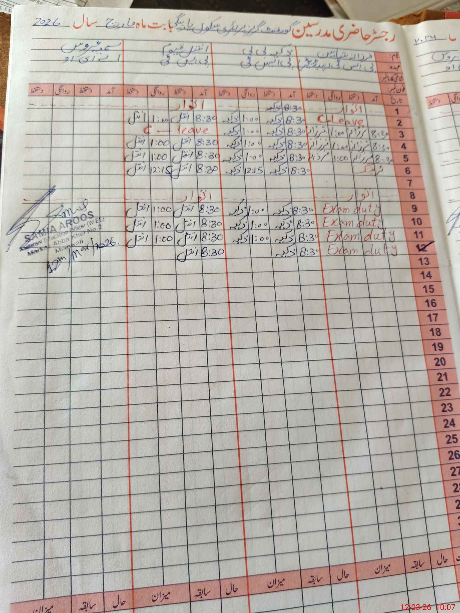 | 38**** | Fa**** Sh**** | PST Arts | Regular | 0 | 0 | 0 | 0 | 0 | 0 | 0 | 0 | 0 | Exam Duty |