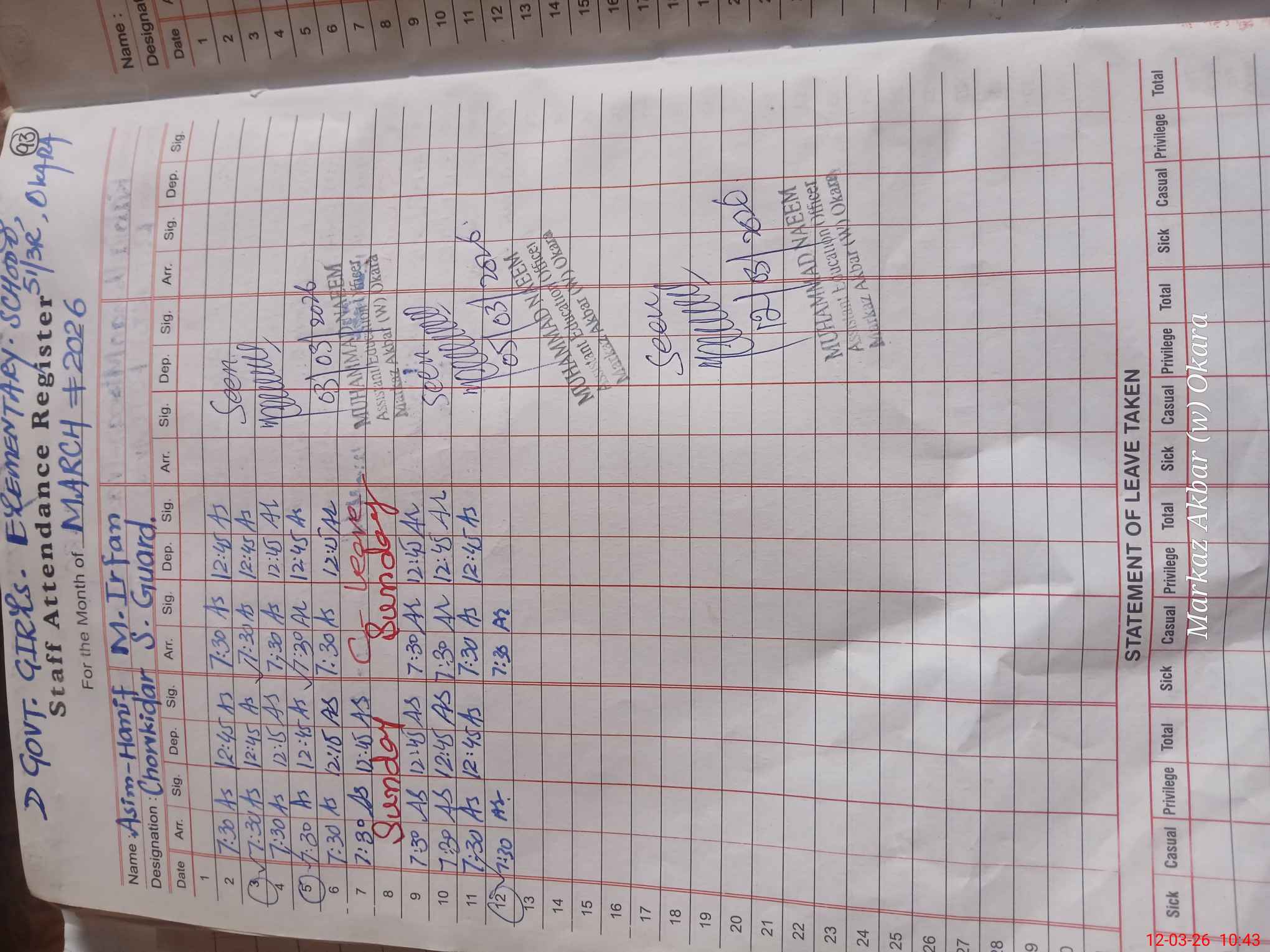 | CNIC | Full Name | Designation | R/C | Absence During Last Calender Month |