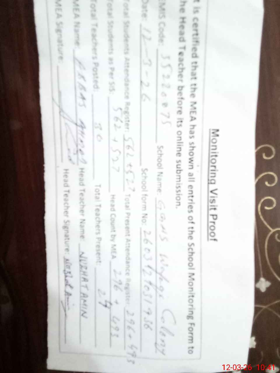 | Attendance Register | Head Teacher | MEA with School | Visit Proof |