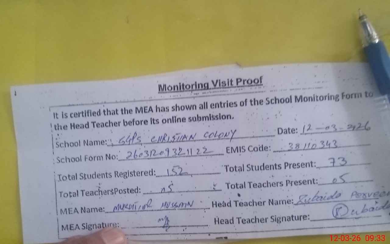 | EMIS Code: 38110343 | Name of School: GGPS CHRISTIAN COLONY | |||
