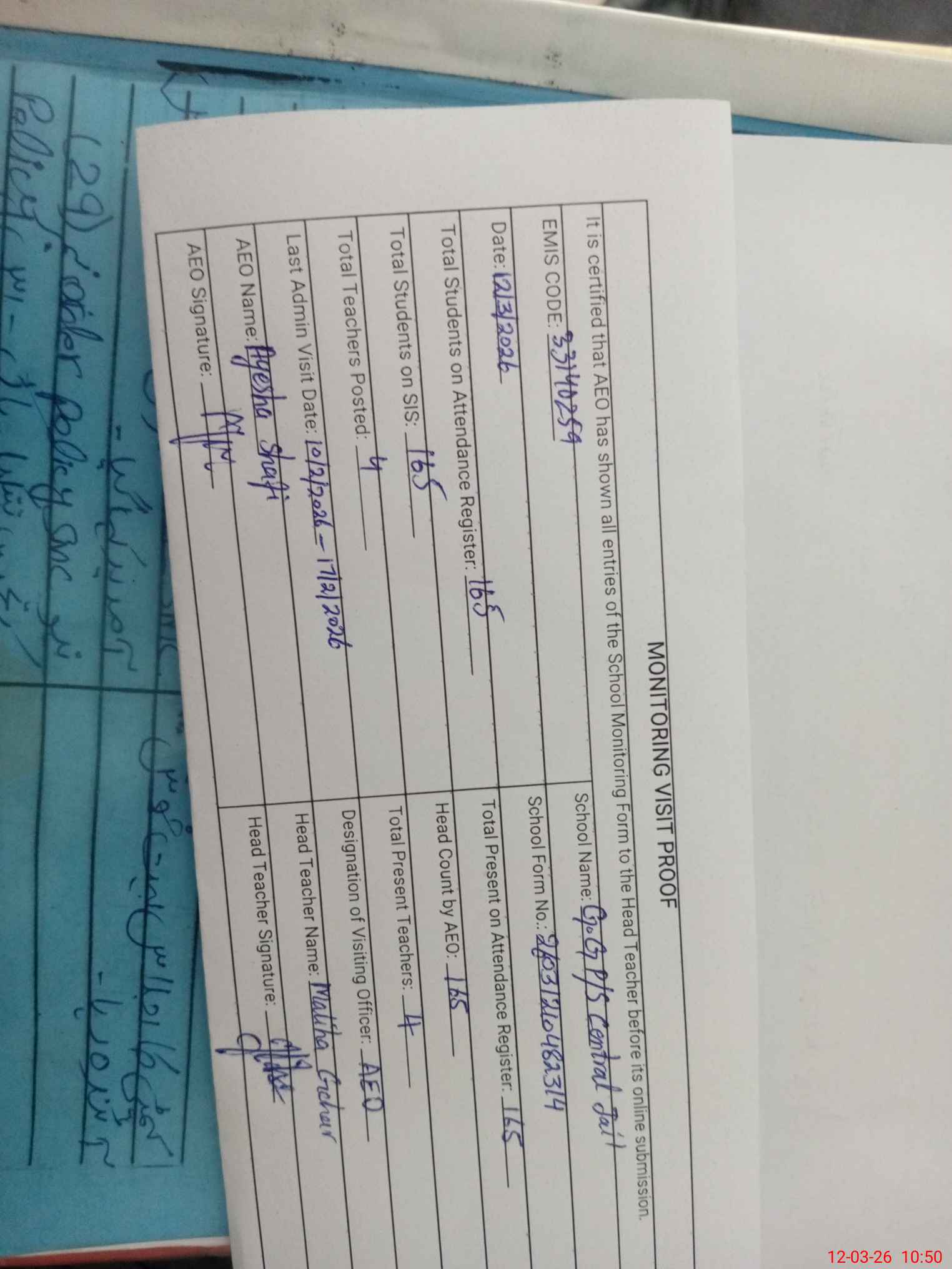 | Attendance Register | Head Teacher | MEA with School | Visit Proof |