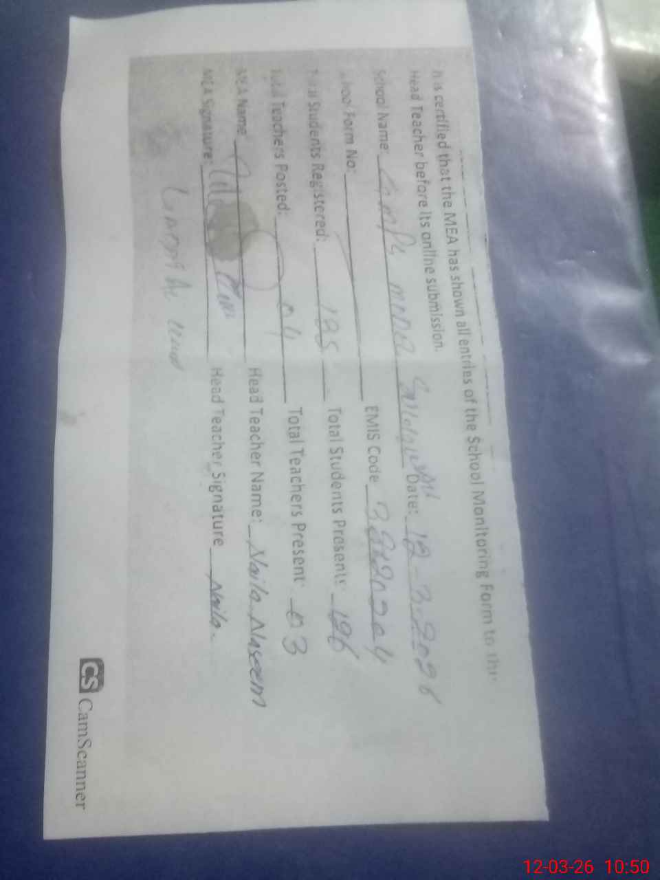 | Name: FA**** UR**** Designation: (School Headmaster's/Headmistress's) PTC/JV Phone/Cell Number: 03**** |