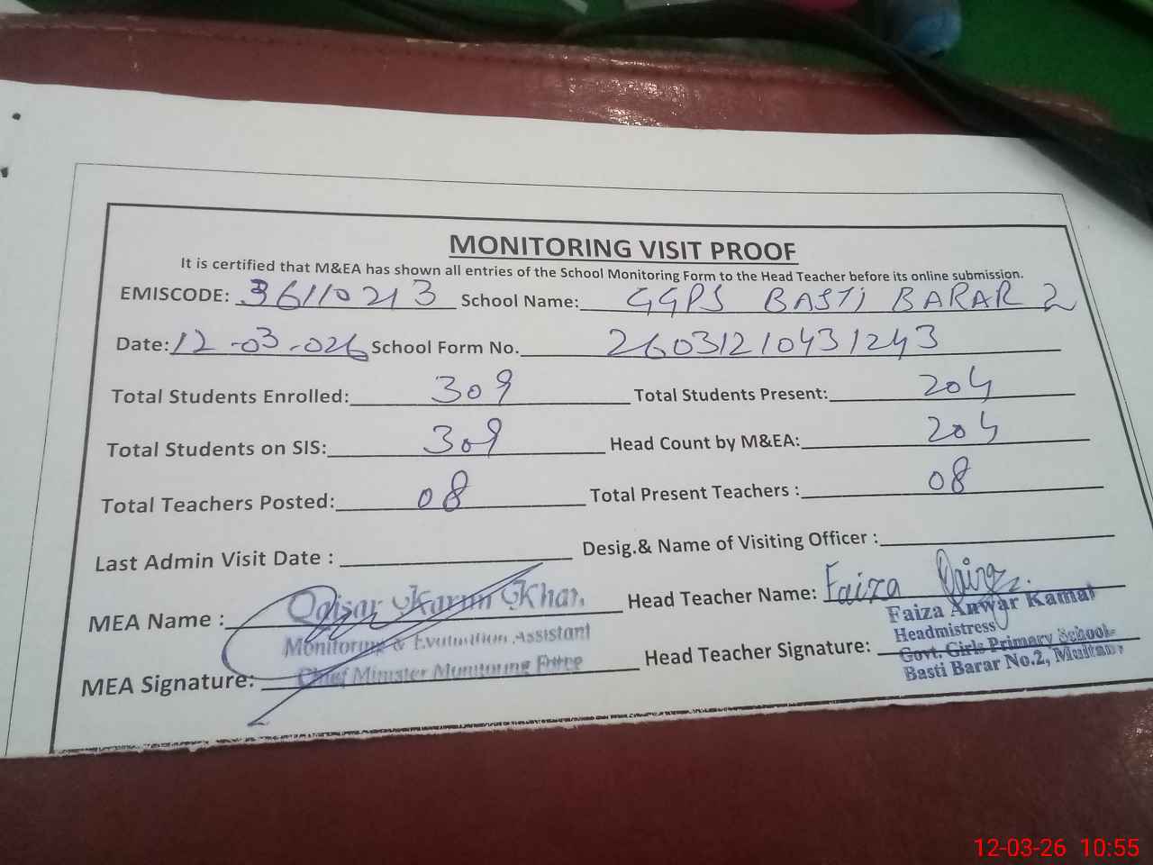 | Attendance Register | Head Teacher | MEA with School | Visit Proof |