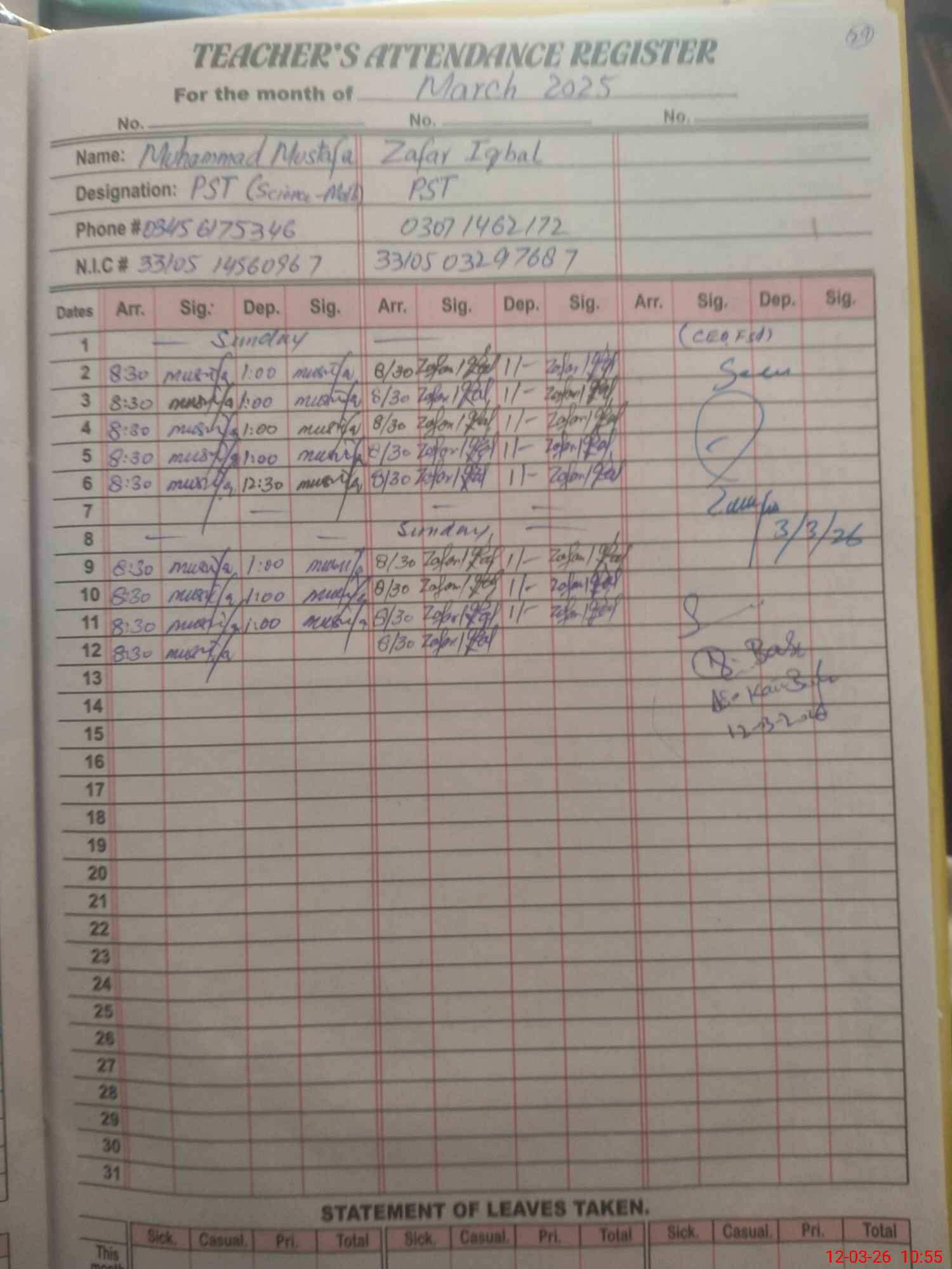 | Name: MU**** RA**** AK**** Designation: (School Headmaster's/Headmistress's) EST ARTS Phone/Cell Number: 03**** |