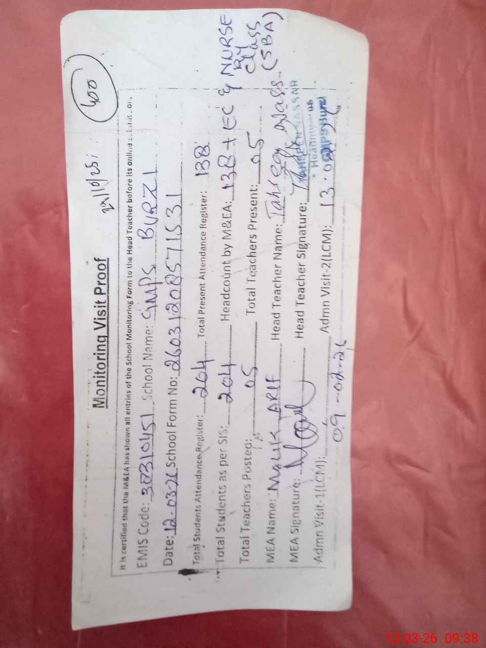 | Attendance Register | Head Teacher | MEA with School | Visit Proof |