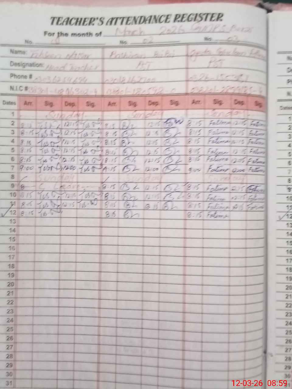 | CNIC | Full Name | Designation | R/C | Absence during last cal. month |