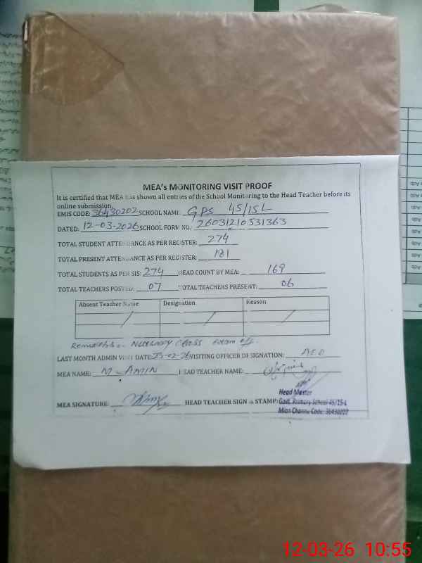 | EMIS Code: 36430202 | Name of School: GPS 45/15-L, MIAN CHANNU | |||