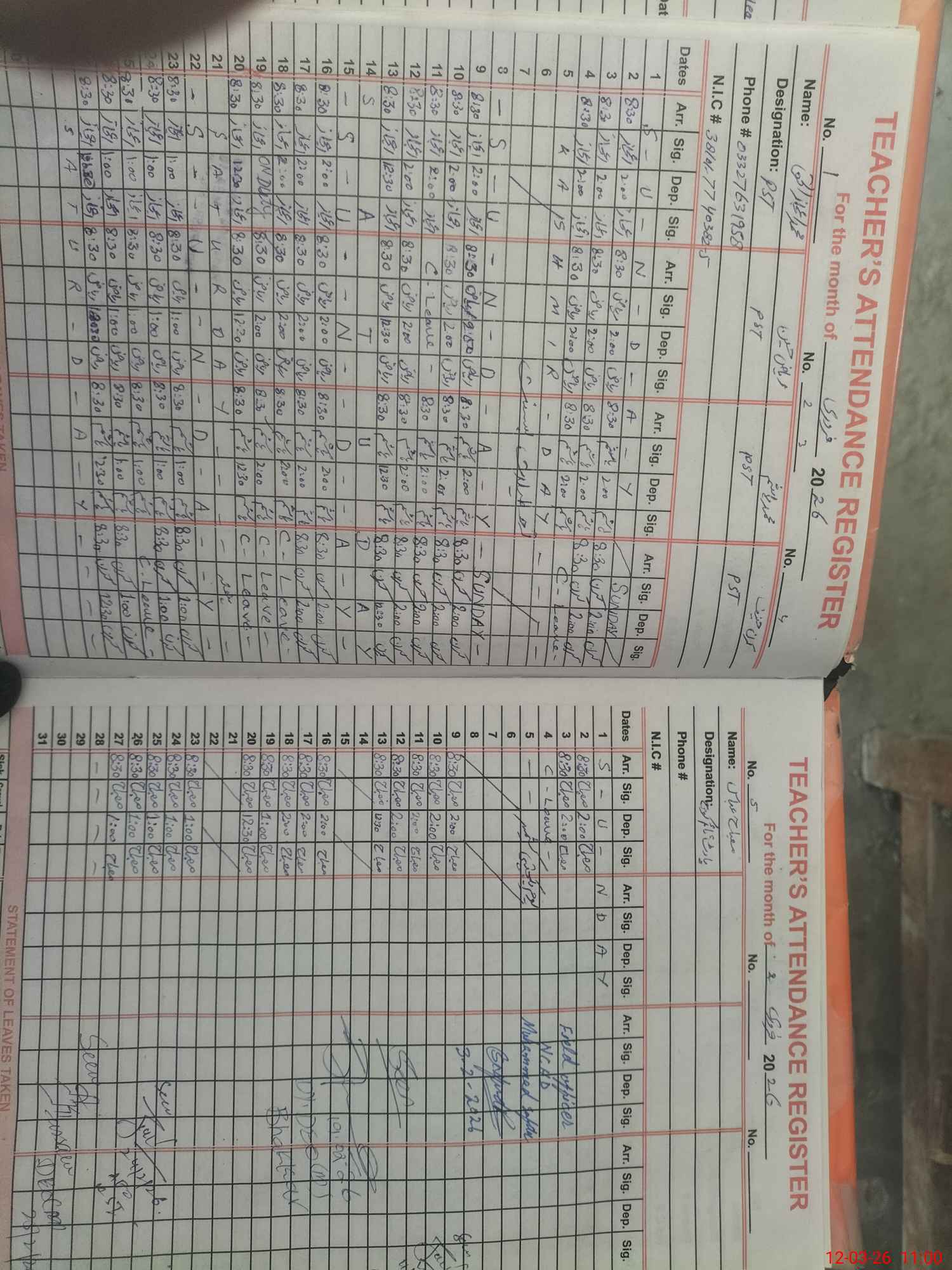| CNIC | Full Name | Designation | R/C | Absence During Last Calender Month |