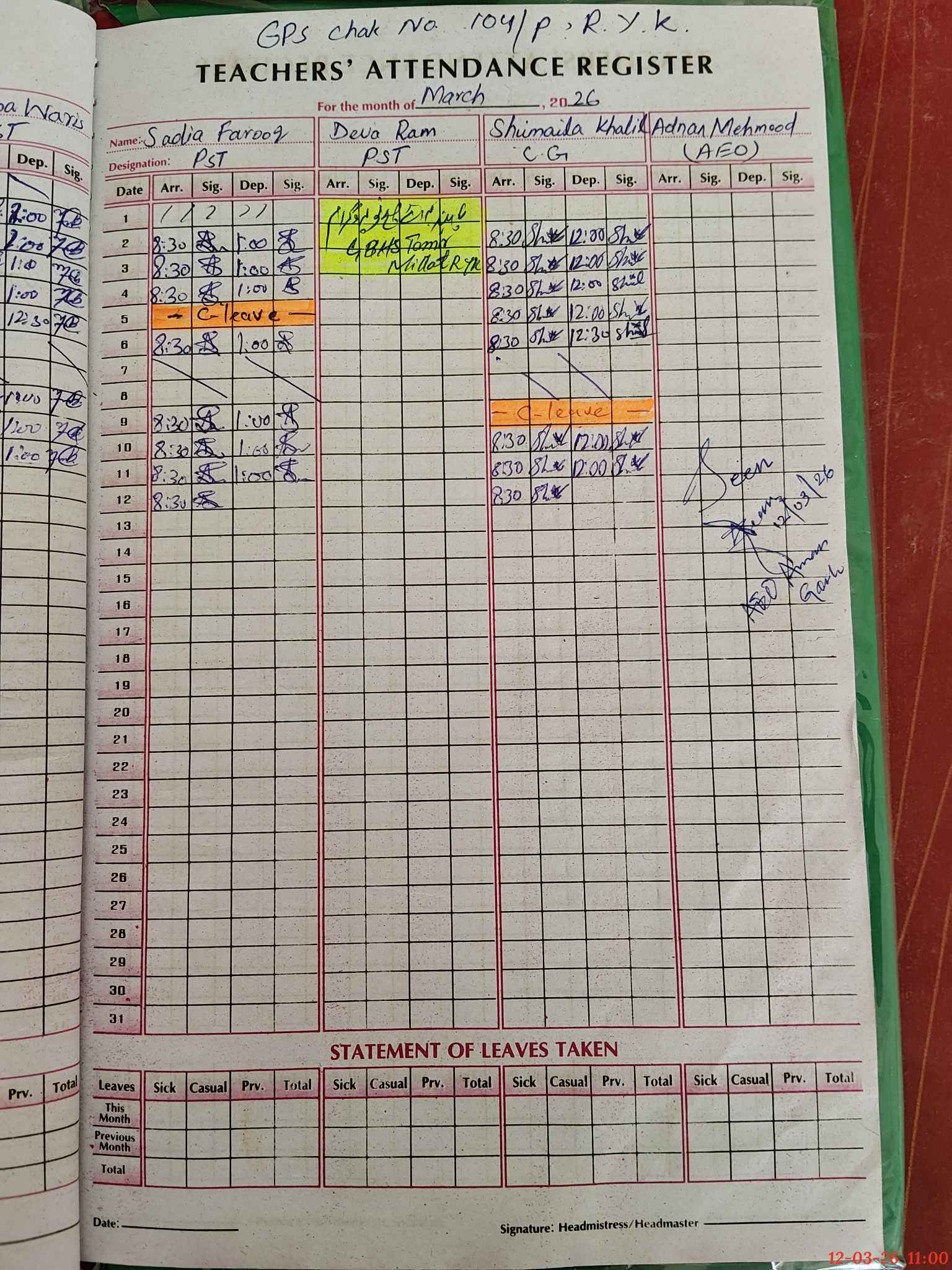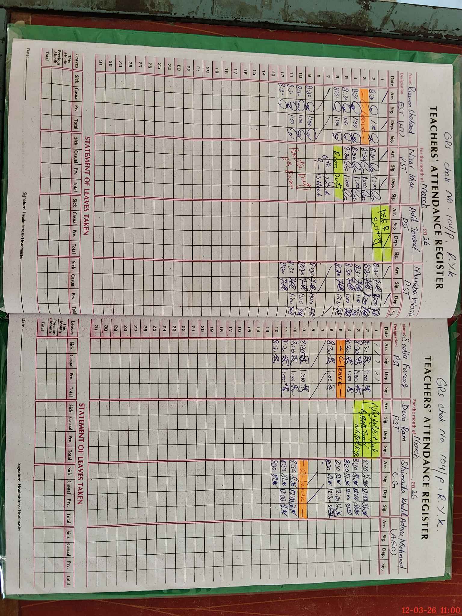 | Leave | Duty | Absent | Maternity | Medical | Ex- Pak |