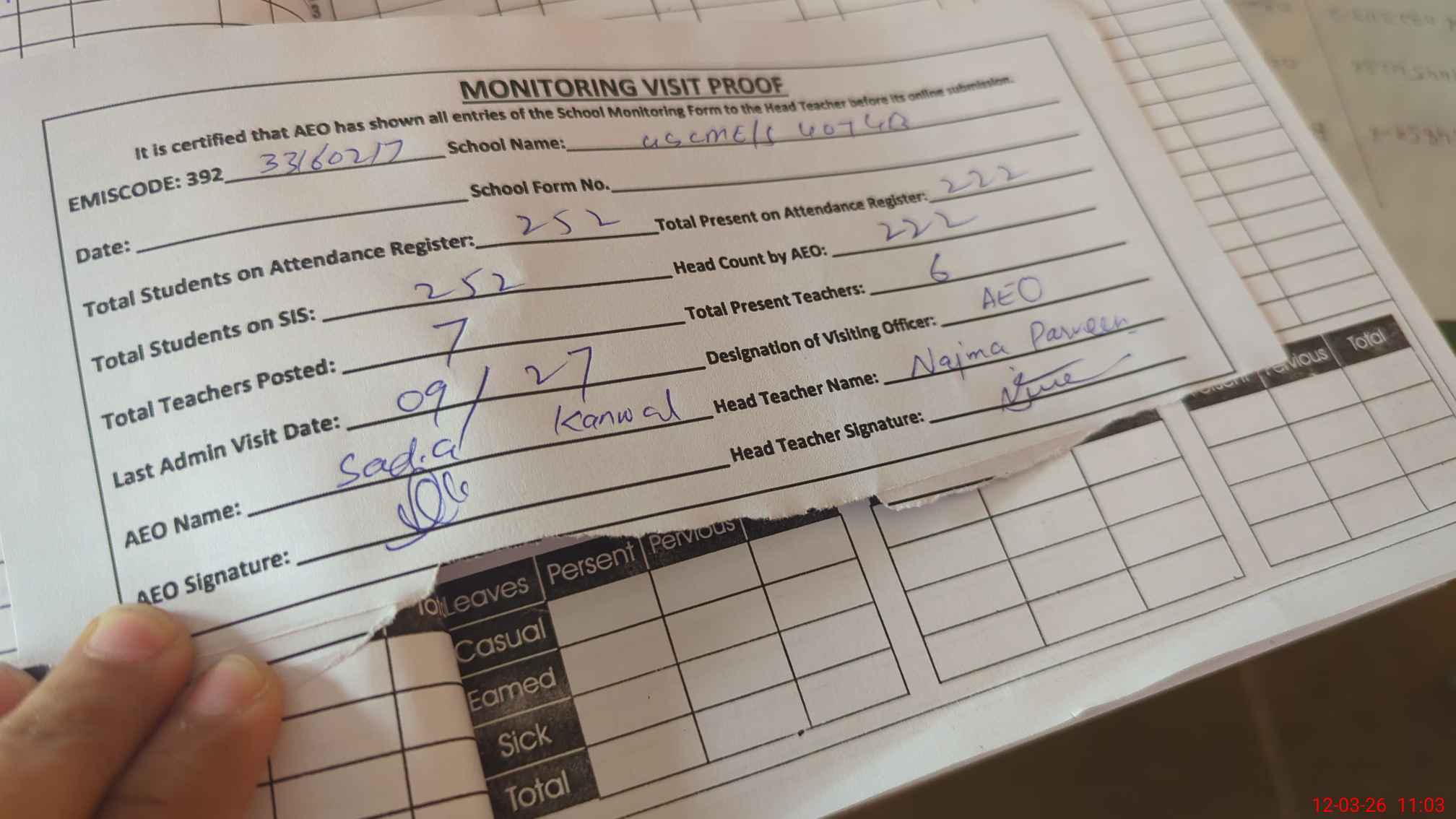 | Attendance Register | Head Teacher | MEA with School | Visit Proof |