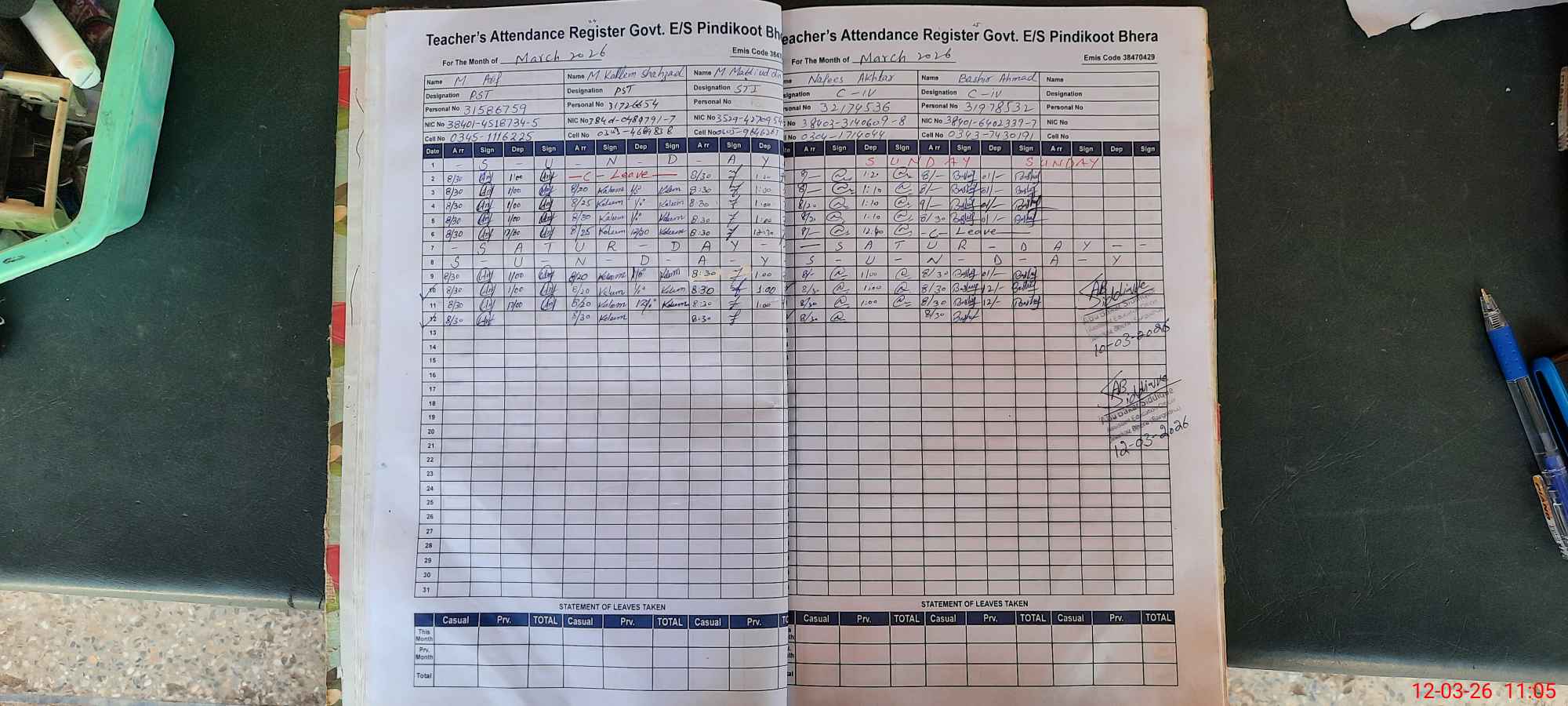 | CNIC | Full Name | Designation | R/C | Absence During Last Calender Month |