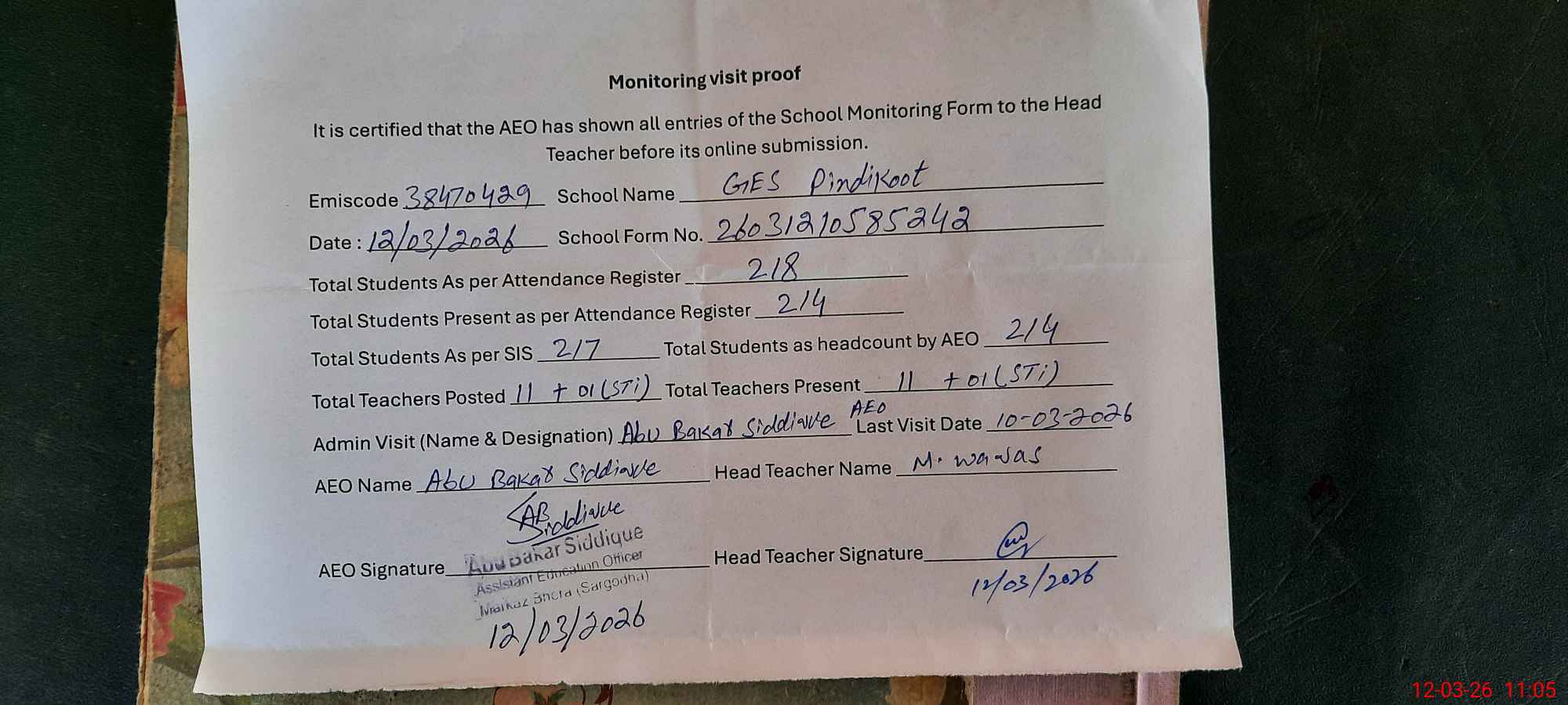 | Attendance Register | Head Teacher | MEA with School | Visit Proof |