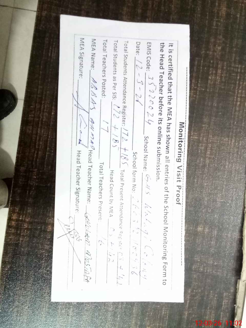 | EMIS Code: 35220024 | Name of School: GHS WAFAQI COLONY LAHORE | |||