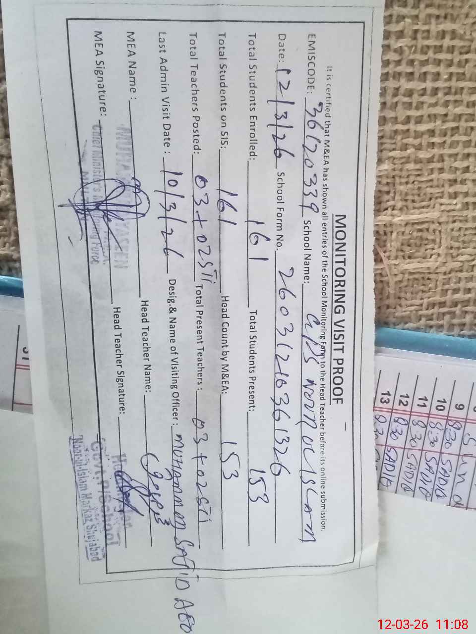 | Attendance Register | Head Teacher | MEA with School | Visit Proof |