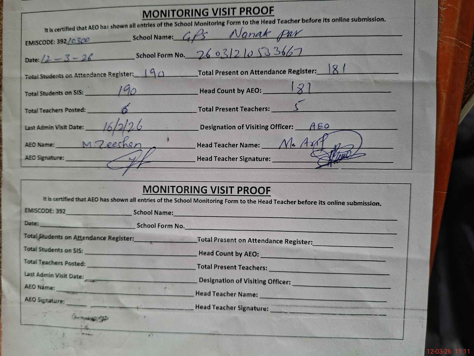 | Attendance Register | Head Teacher | MEA with School | Visit Proof |