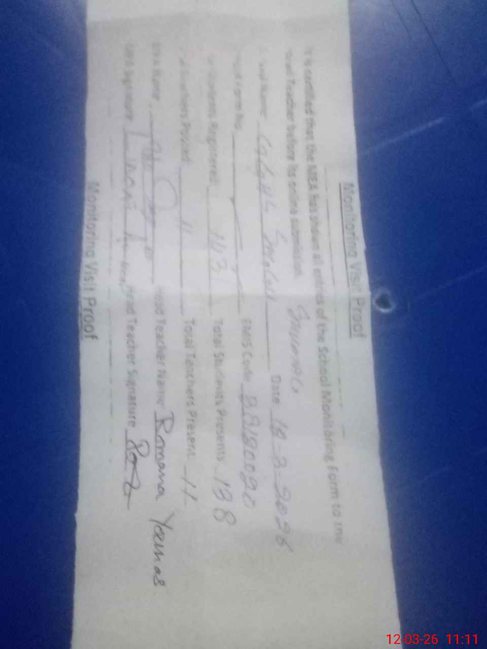 | Attendance Register | Head Teacher | MEA with School | Visit Proof |