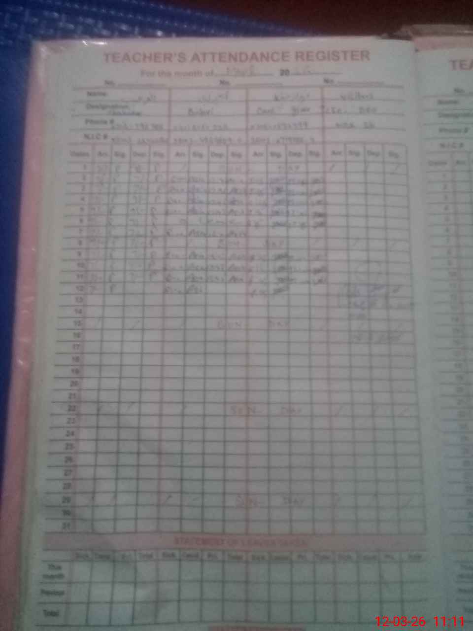 | CNIC | Full Name | Designation | R/C | Absence During Last Calender Month |