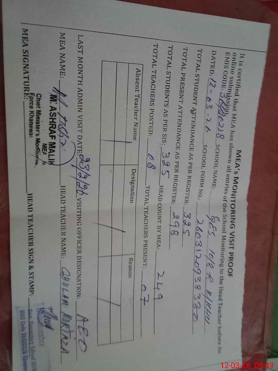 | Attendance Register | Head Teacher | MEA with School | Visit Proof |