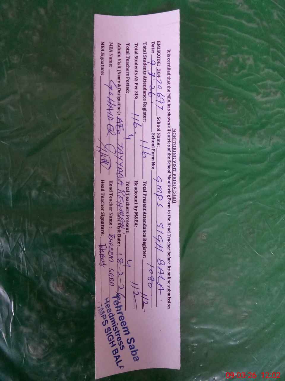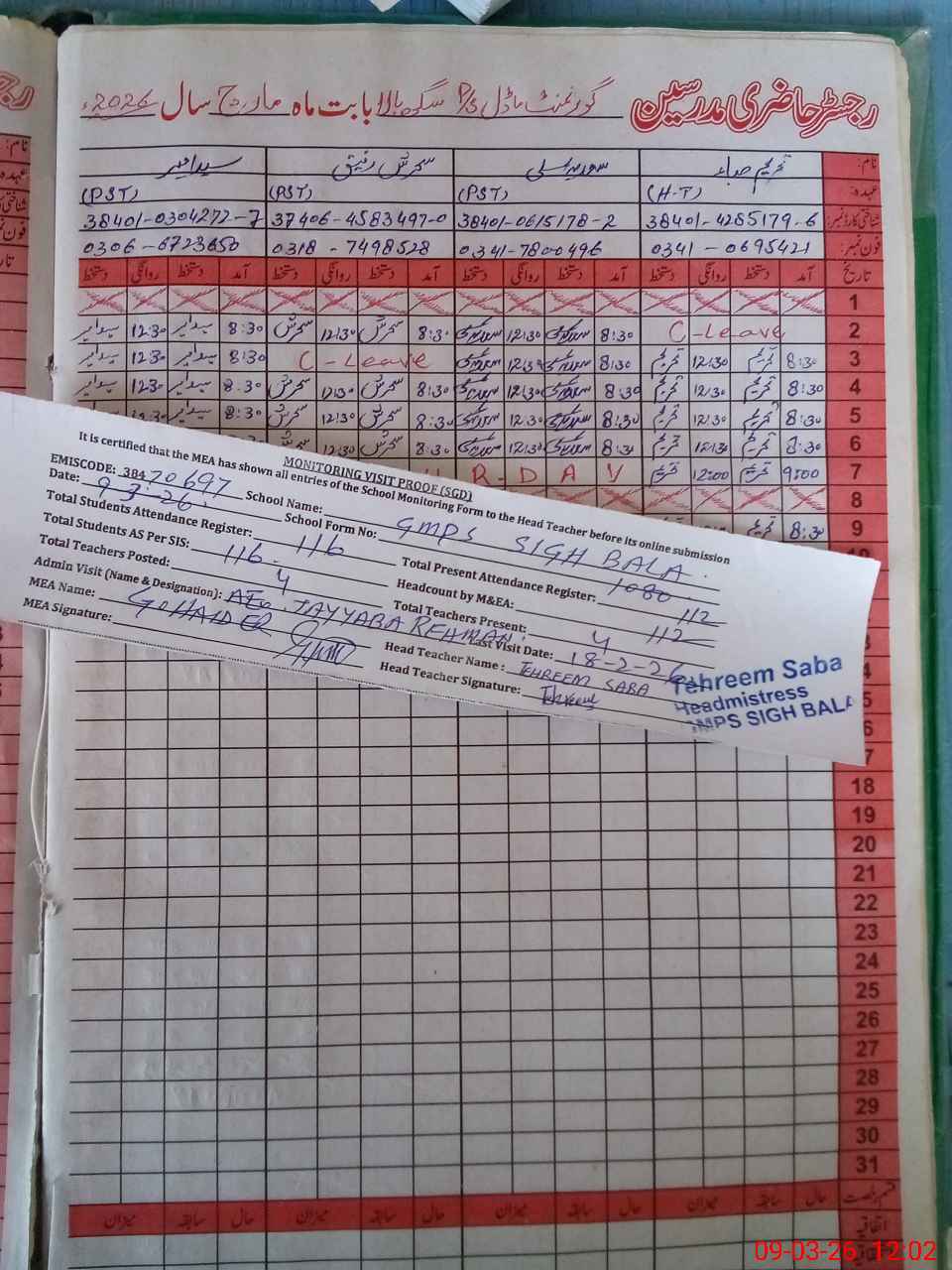 | Attendance Register | Head Teacher | MEA with School | Visit Proof |