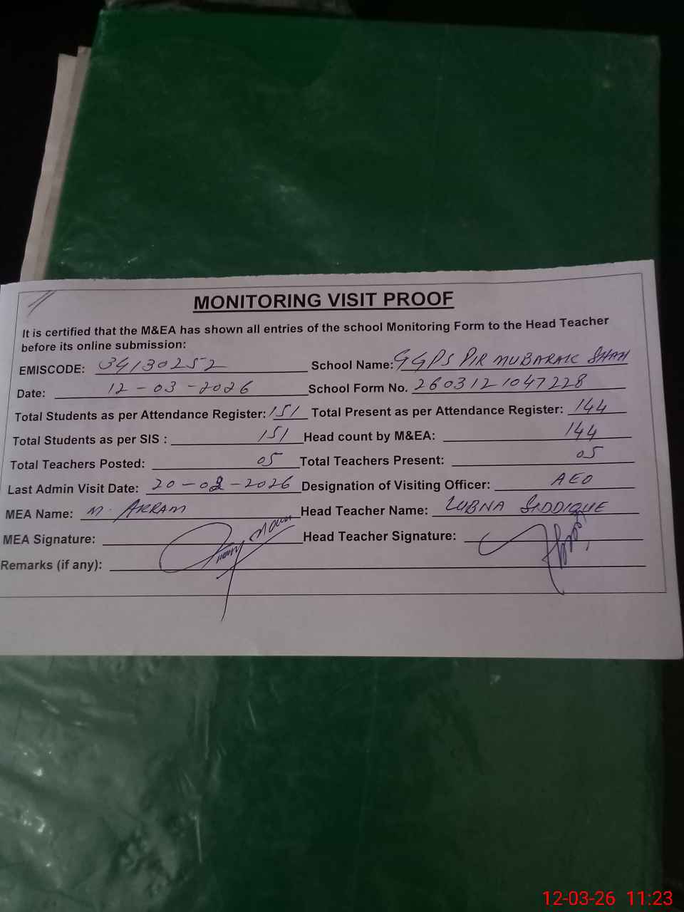 | EMIS Code: 34130252 | Name of School: GGPS PIR MUBARIK SHAH (KAMOKE) | |||