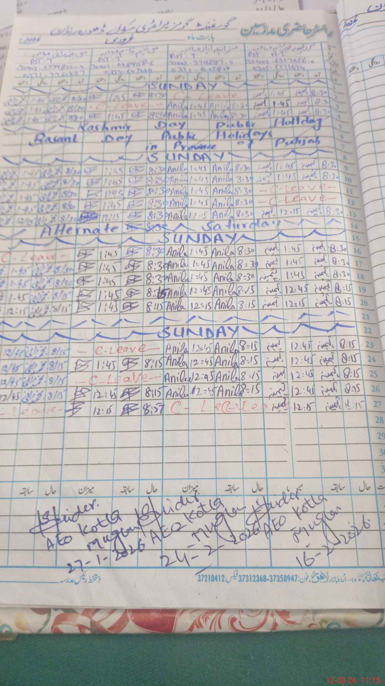 | CNIC | Full Name | Designation | R/C | Absence During Last Calender Month |