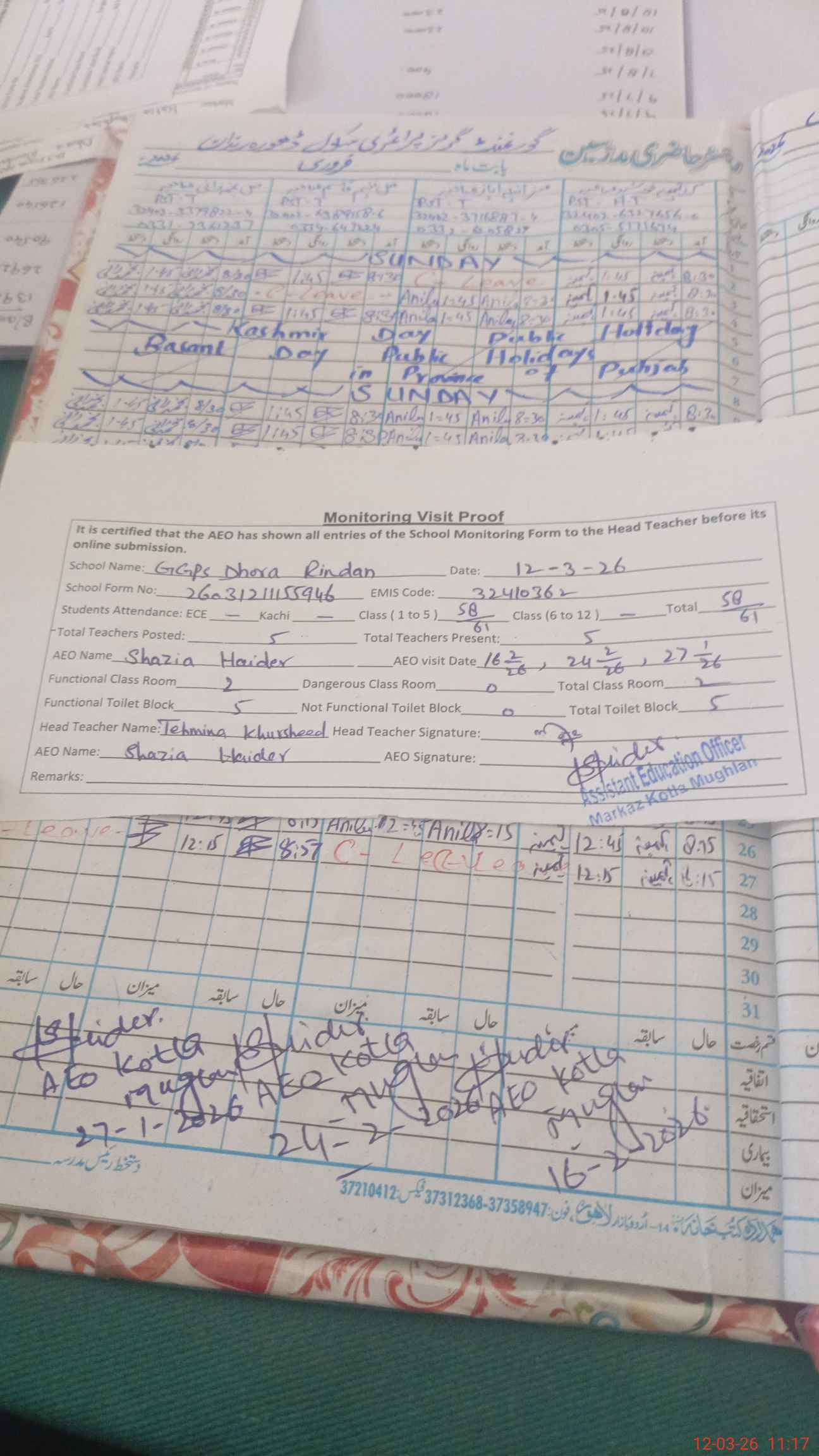| Attendance Register | Head Teacher | MEA with School | Visit Proof |