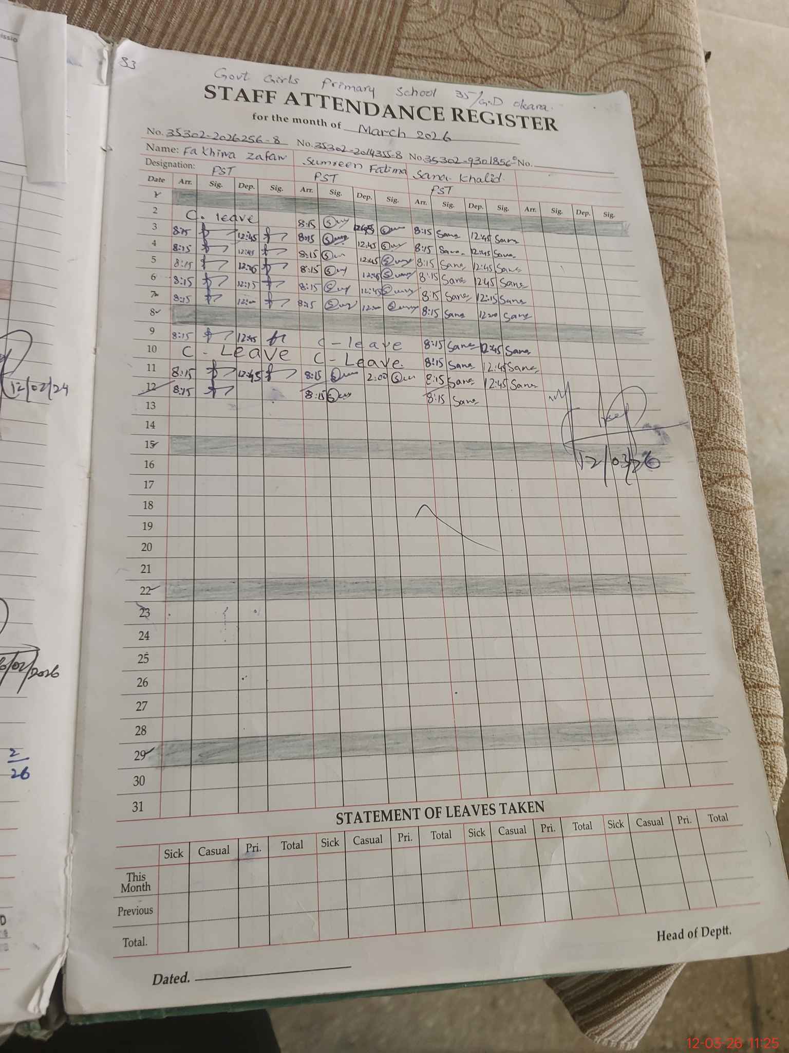 | CNIC | Full Name | Designation | R/C | Absence During Last Calender Month |