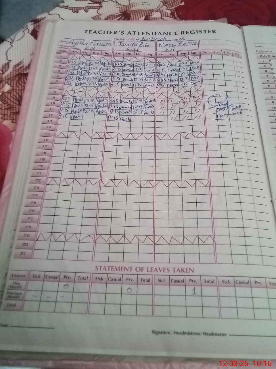 | 36**** | Na**** Ba**** | PST Arts | Regular | 0 | 0 | 0 | 0 | 0 | 0 | 0 | 0 | 0 | Exam Duty |