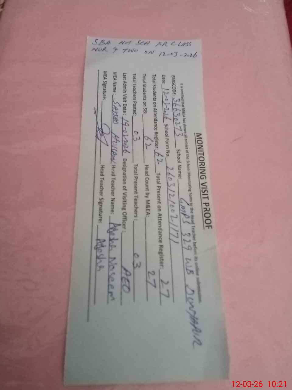 | Attendance Register | Head Teacher | MEA with School | Visit Proof |