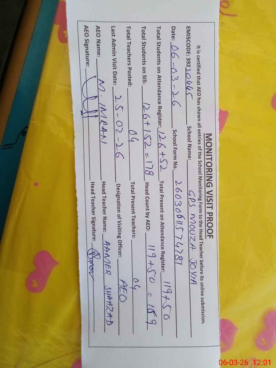 | EMIS Code: 39220445 | Name of School: GPS JOYIA P.O NOORA PATH ARIF WALA | |||