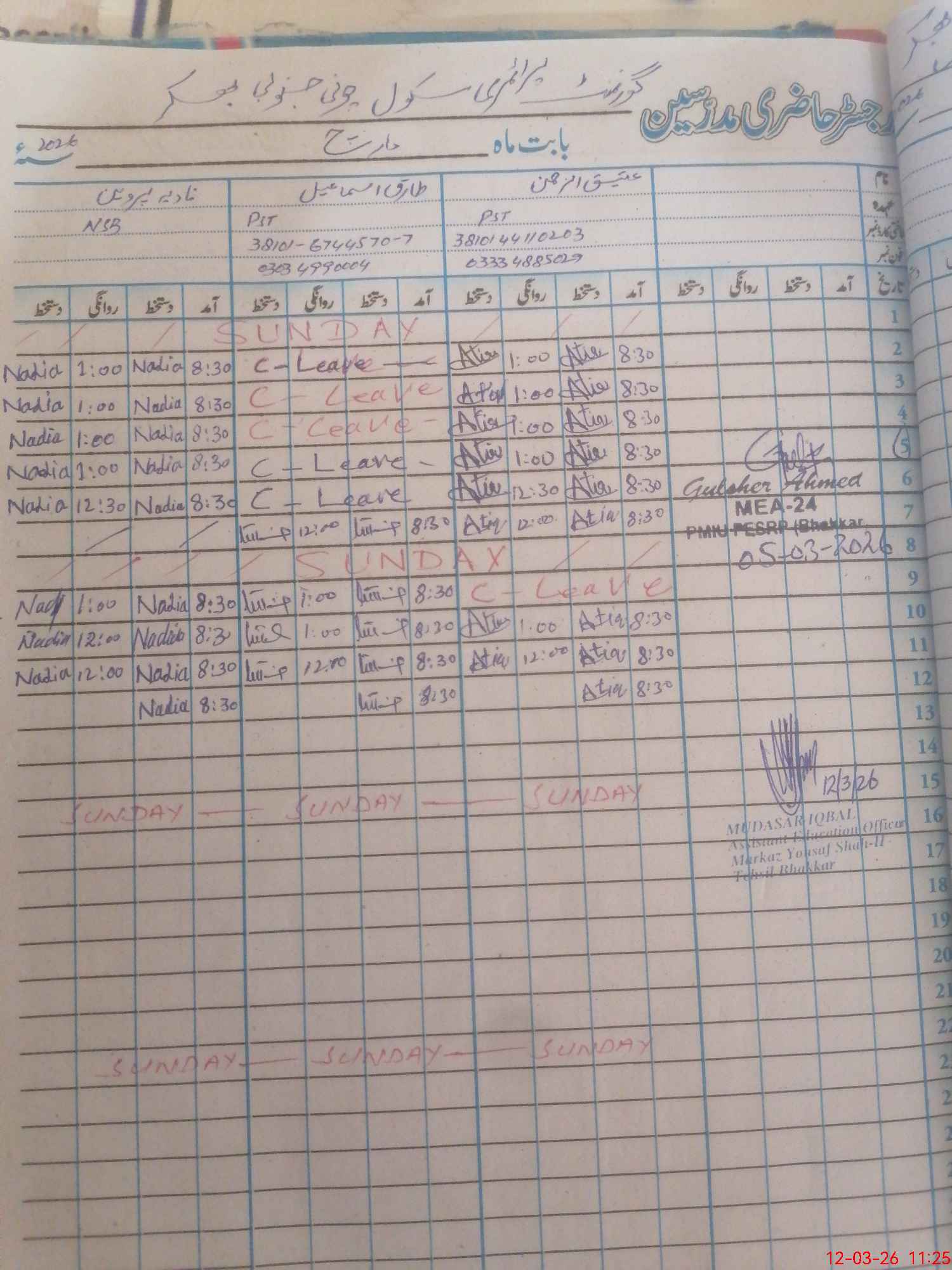 | CNIC | Full Name | Designation | R/C | Absence During Last Calender Month |