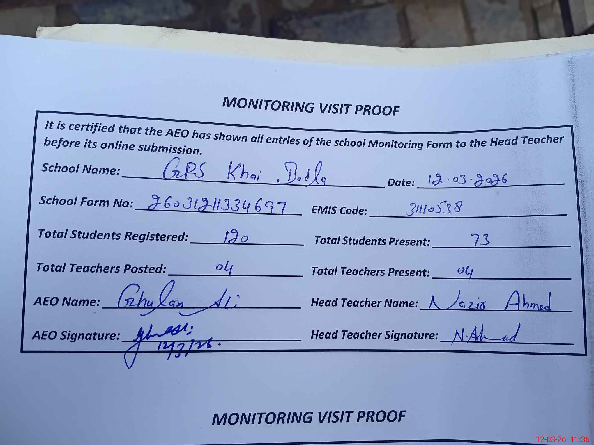 | EMIS Code: 31110538 | Name of School: GPS KHAI BODLA | |||