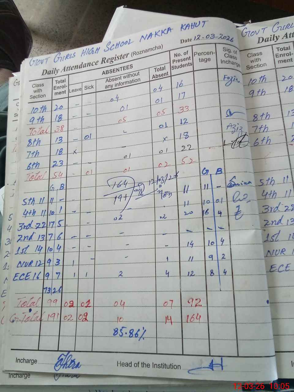 | Total no. of Classrooms: 15 No. of Classrooms Used for Teaching: 12 No. of Classrooms Storing Old Furniture, FTBs, etc: 0Comments if Any: 0 |