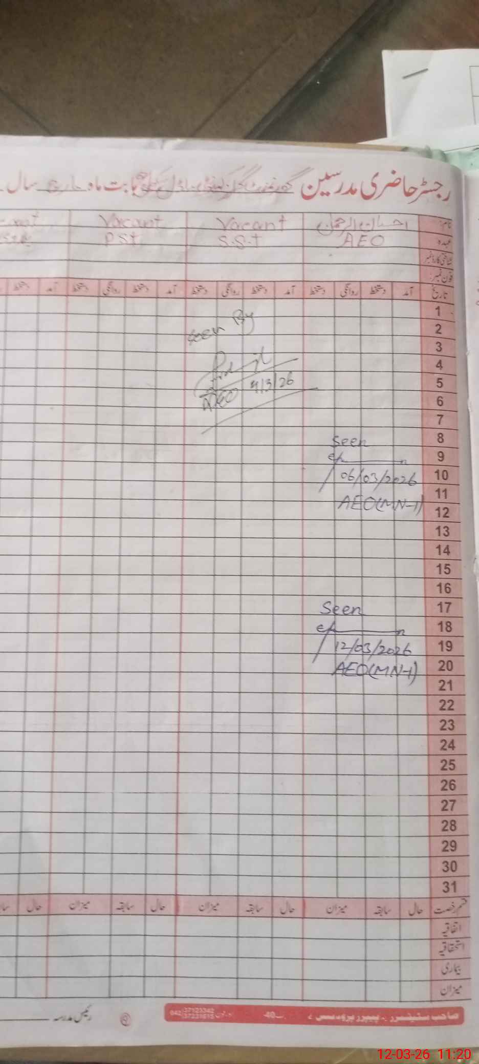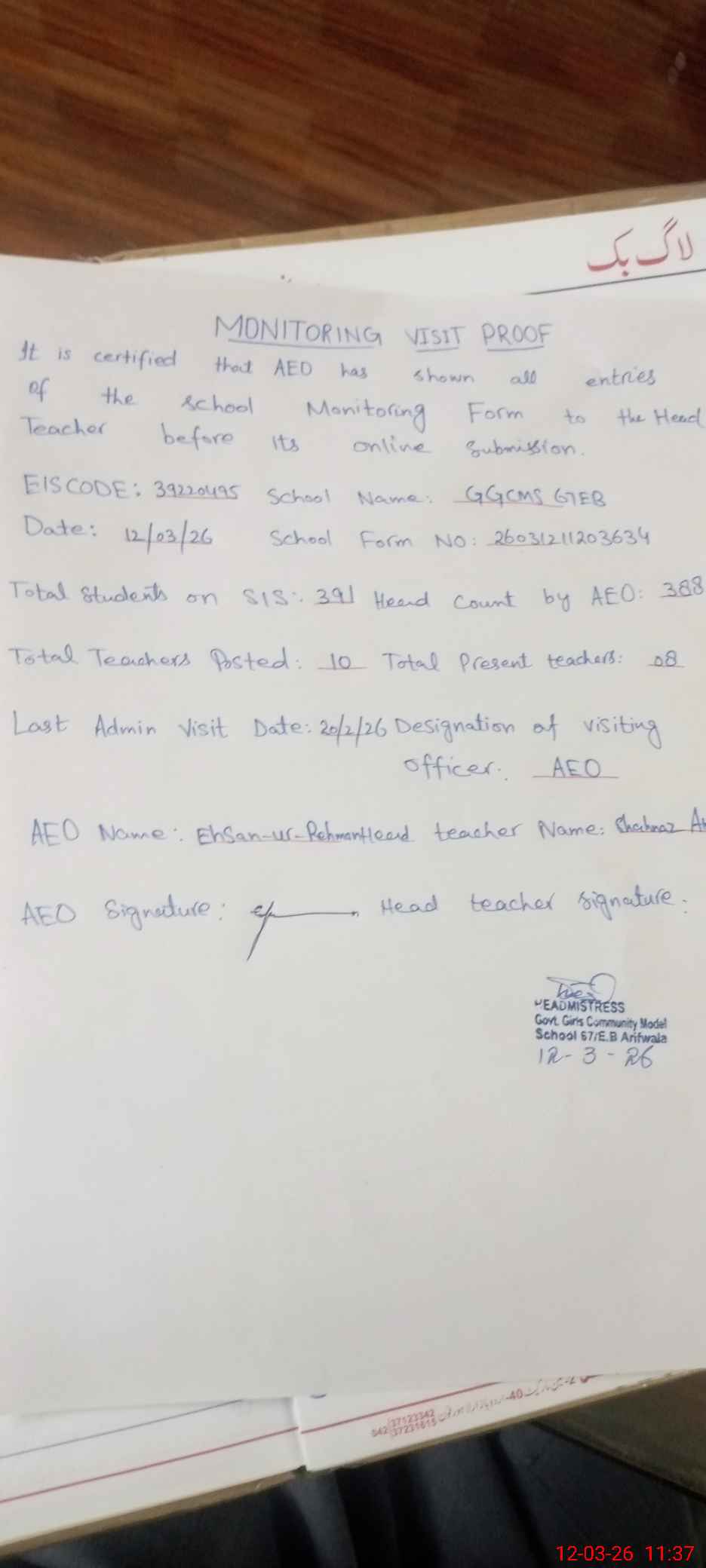 | Attendance Register | Head Teacher | MEA with School | Visit Proof |